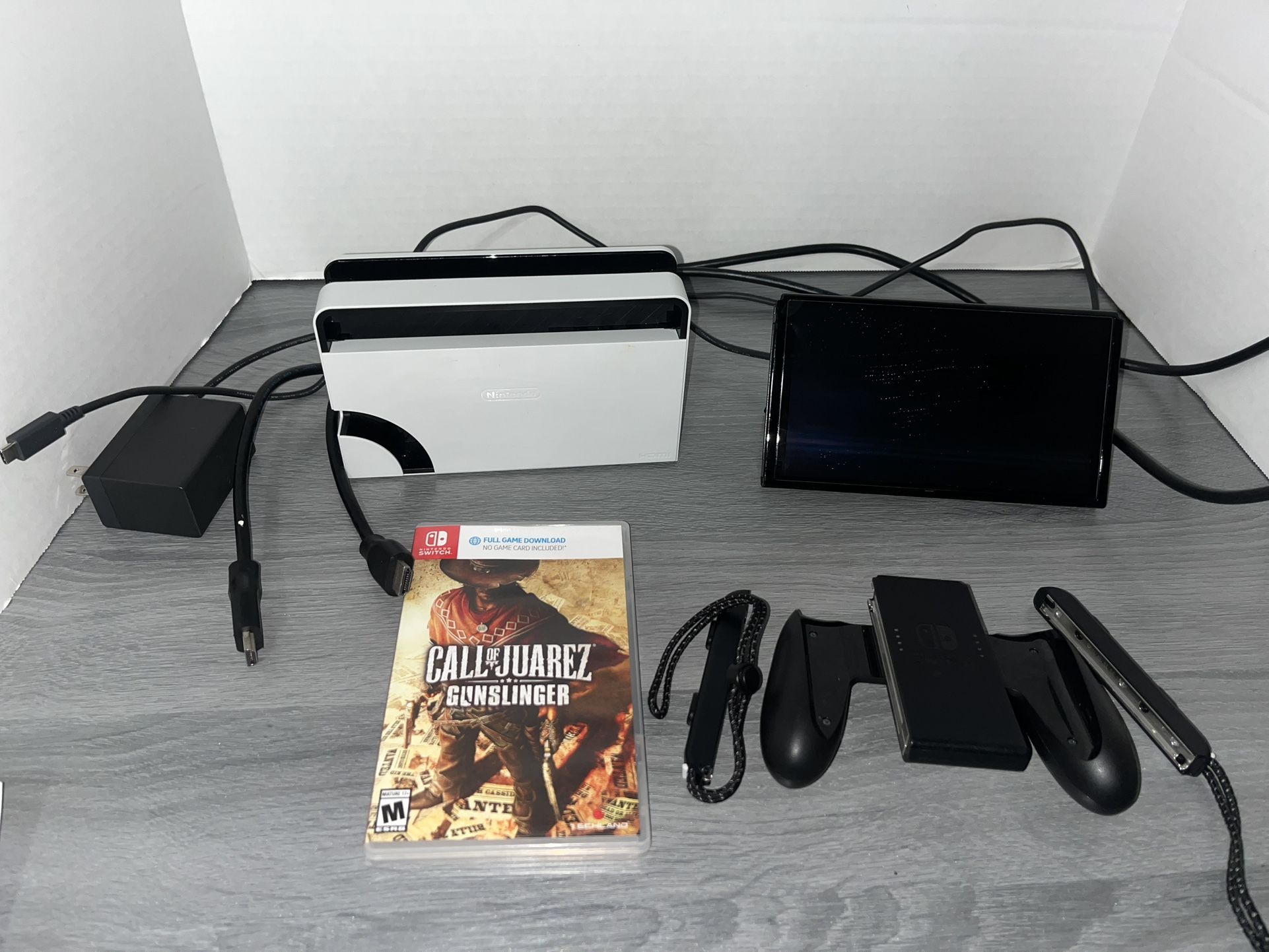 Nintendo Switch OLED (White Joy-Cons) in great condition. Includes all original Nintendo accessories: • Official Nintendo Dock • Official Power Adapter • Official HDMI Cable • Official Joy-Con Grip • Official L/R Joy-Con Straps • Bonus Game: Call of Juarez: Gunslinger (Digital Download Code) Everything works great and is ready to play. No third-party parts – this is a complete authentic bundle.