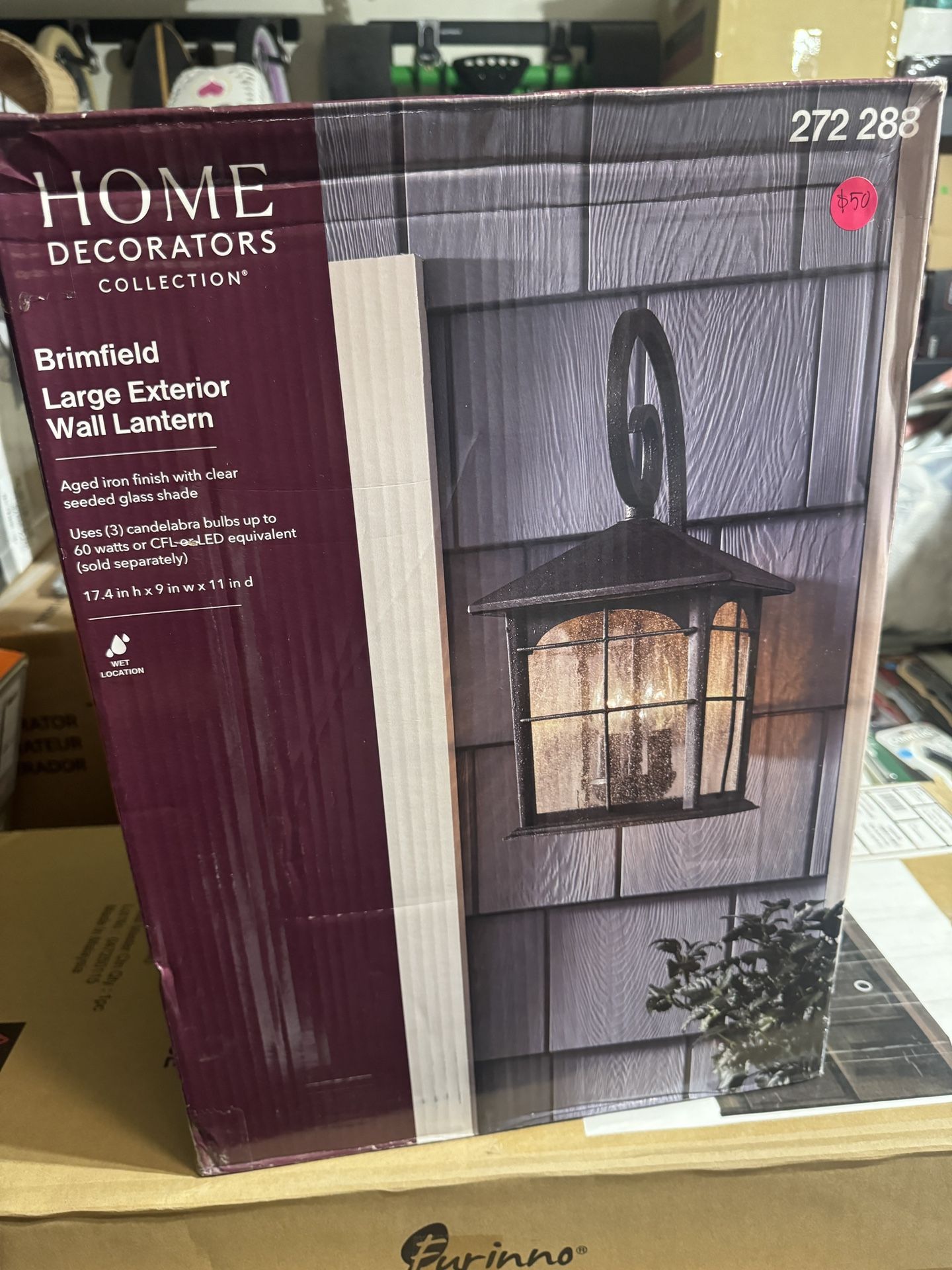 Brand new Home Decorators Collection Brimfield 17.5 in. Aged Iron 3-Light Line Voltage Outdoor Wall Light Sconce with No Bulbs Included