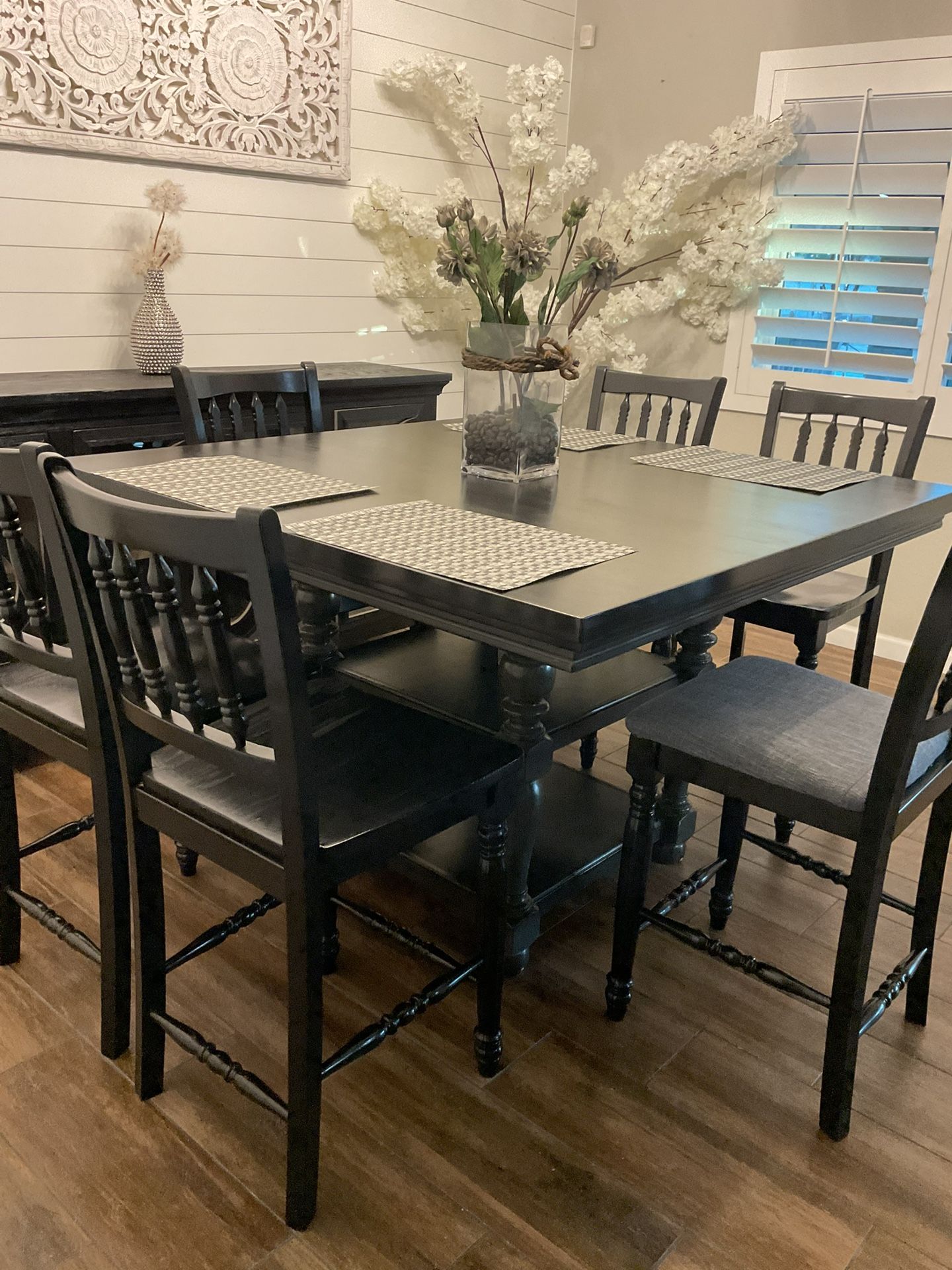 Beautiful refurbished modern black charcoal gray wash high pub dinning table with 6 chairs, 2 chairs have new upholstery. Great for medium or large spaces plus table top has a two tone stain. Table stand has a two tier for decor. Table is solid wood and heavy. *All sales are final *Deposits are not refundable Dimensions: 54x54 Height of table: 36