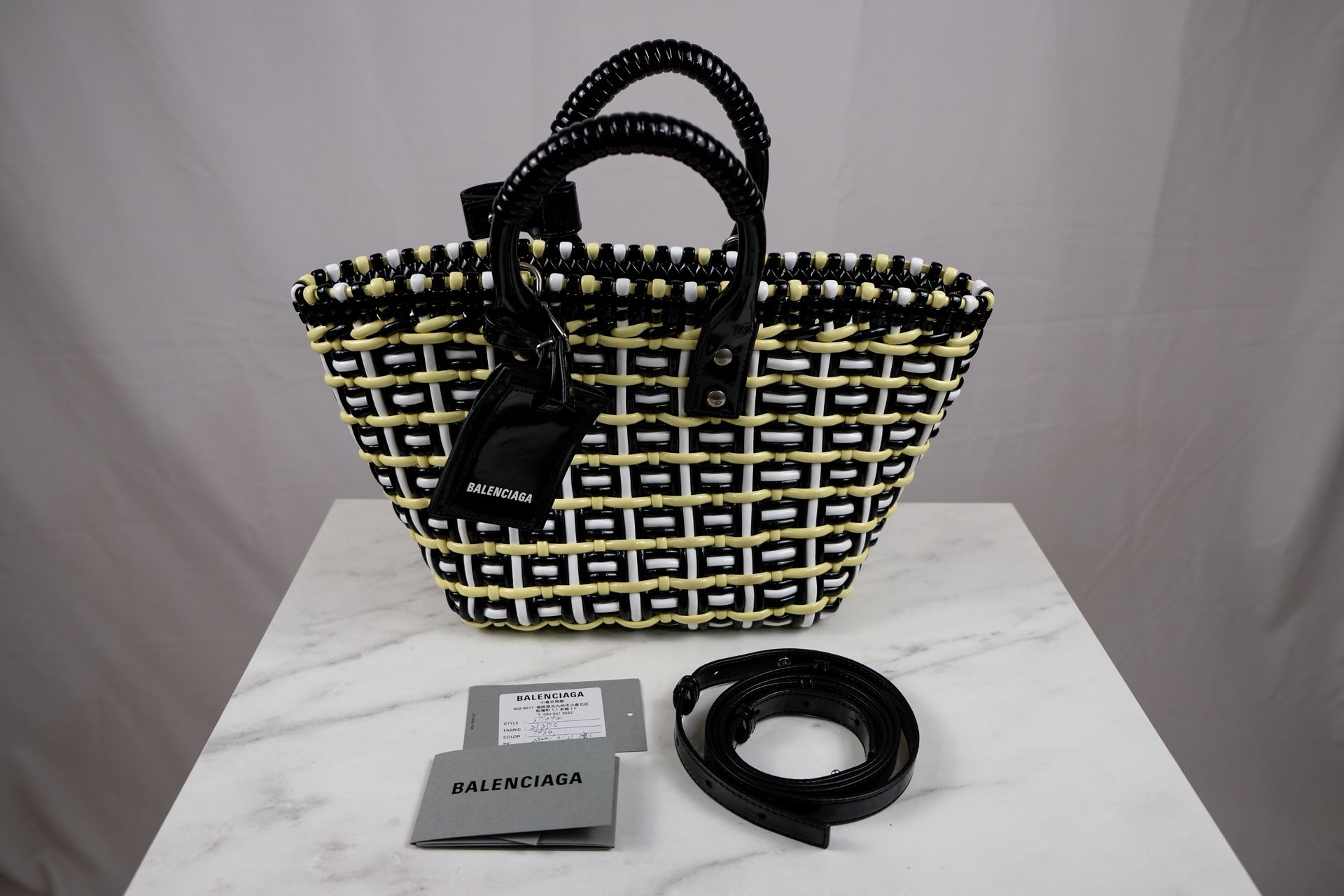 Authentic Balenciaga tote in black/white/yellow woven design with black patent leather trim. Super chic and roomy! Comes with Balenciaga authenticity card/paperwork. β¨ Condition: Excellent preowned (very clean, minor wear) π Medium size, lightweight & stylish π Includes shoulder strap + paperwork #Balenciaga #BalenciagaBag #DesignerBag #LuxuryHandbag #AuthenticBalenciaga #BalenciagaStyle #FashionLuxury #DesignerFinds