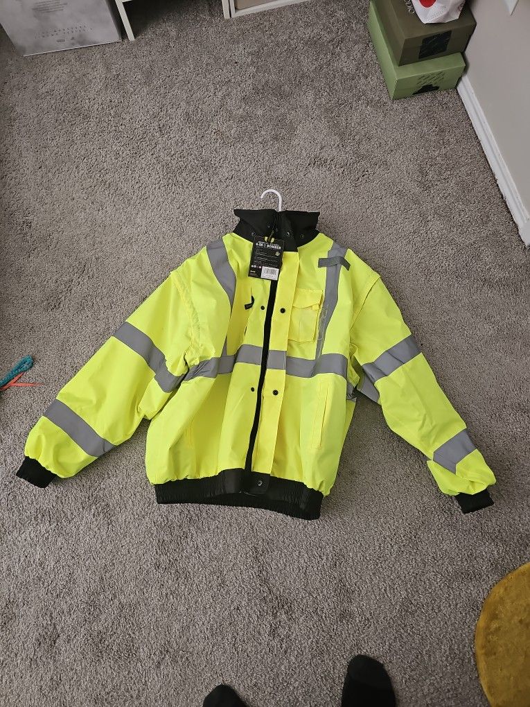 4 in 1 bomber jacket waterproof. Reflective jacket Roll away removable hood Removable polyester sleeves Detachable id badge Multiple pockets inner and outer of jacket