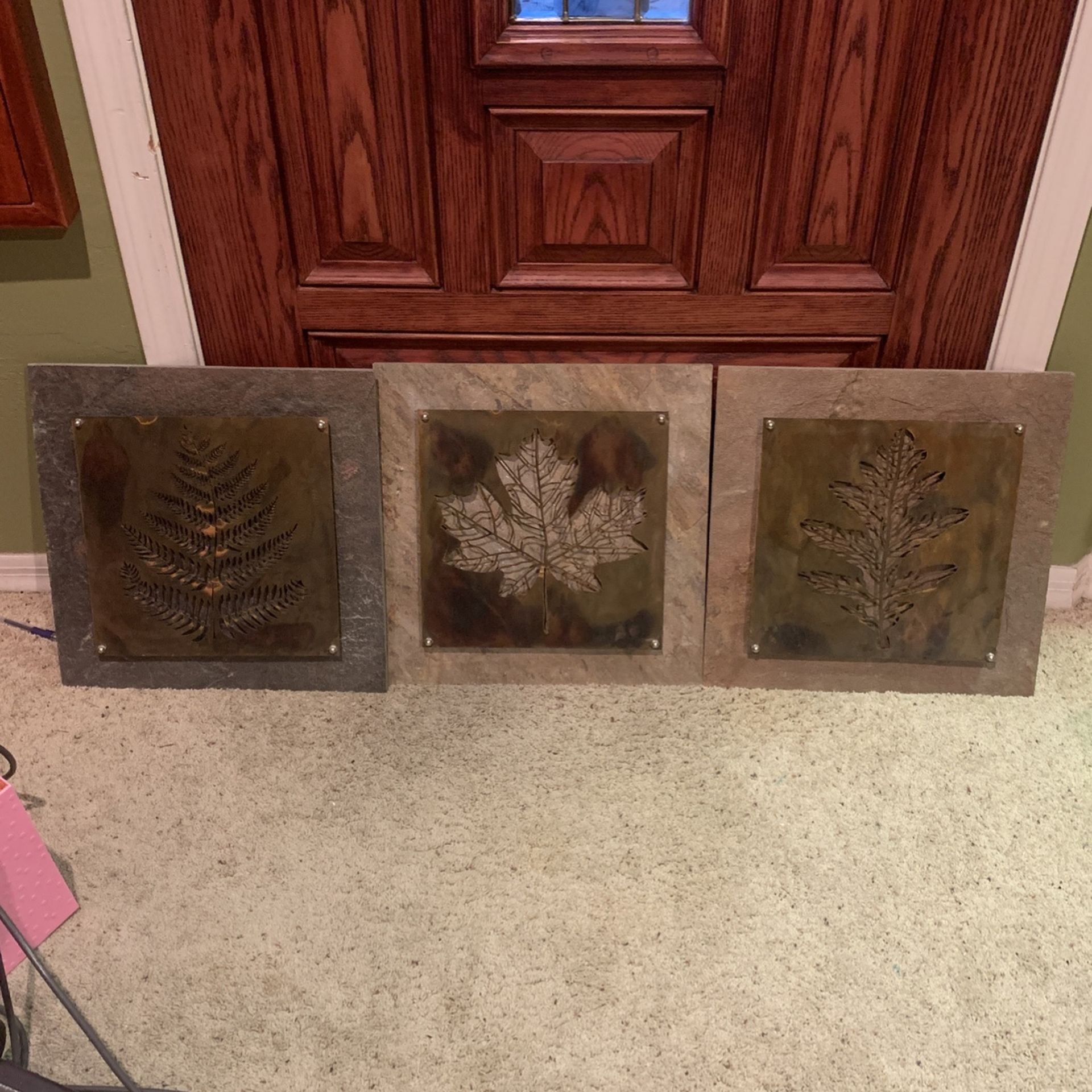 Each piece weighs approximately 13 pounds. Very sturdy and heavy unique wall art. Stone back and metal pounded in. Located in desert ridge at 40th st and pinnacle peak. Retailed for approx $500