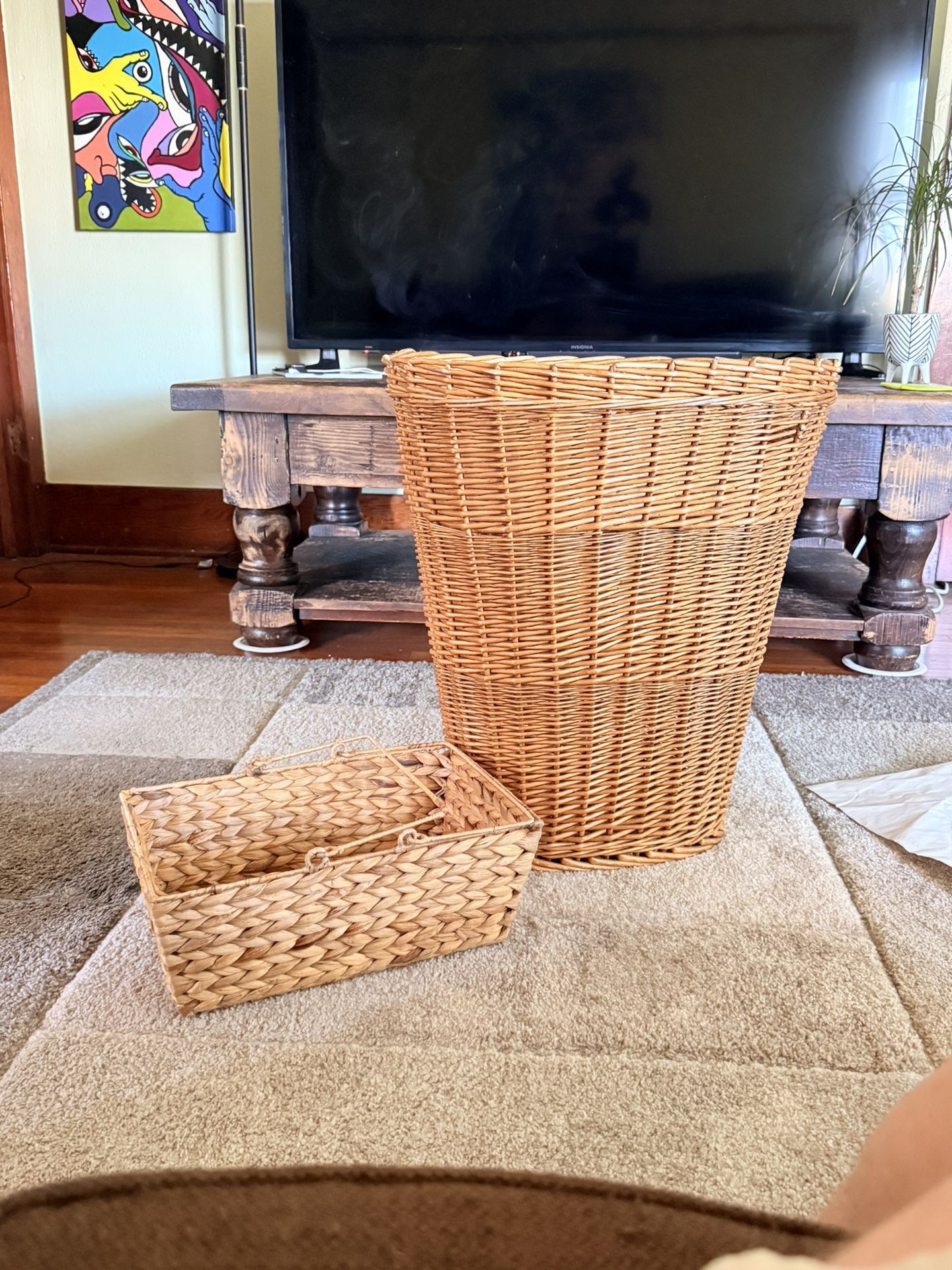 Selling a set of two woven baskets in great condition. Clean, sturdy, and actually useful… not one of those “cute but falls apart if you look at it wrong” situations. Includes: • Large woven basket (great for laundry, blankets, or hiding your life when guests come over) 24” tall • Smaller handled basket (perfect for throws, magazines, or random living room clutter) Both have a warm natural tone that fits really well with boho, rustic, or cozy loft vibes. No damage, no weird smells, just solid baskets that do their job. Moving. Selling both as a set.