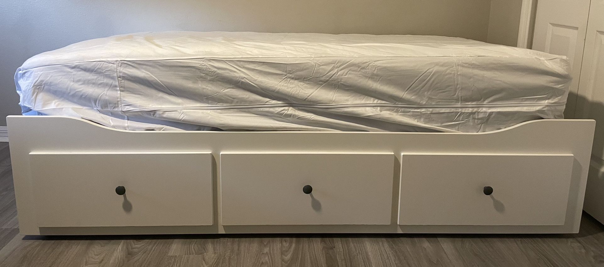Moving Sale! Twin-size bed frame with solid slats (no box spring needed) and 3 spacious storage drawers underneath. Great for extra storage in a small room. Frame only — mattress not included. Good condition. Pick up only.