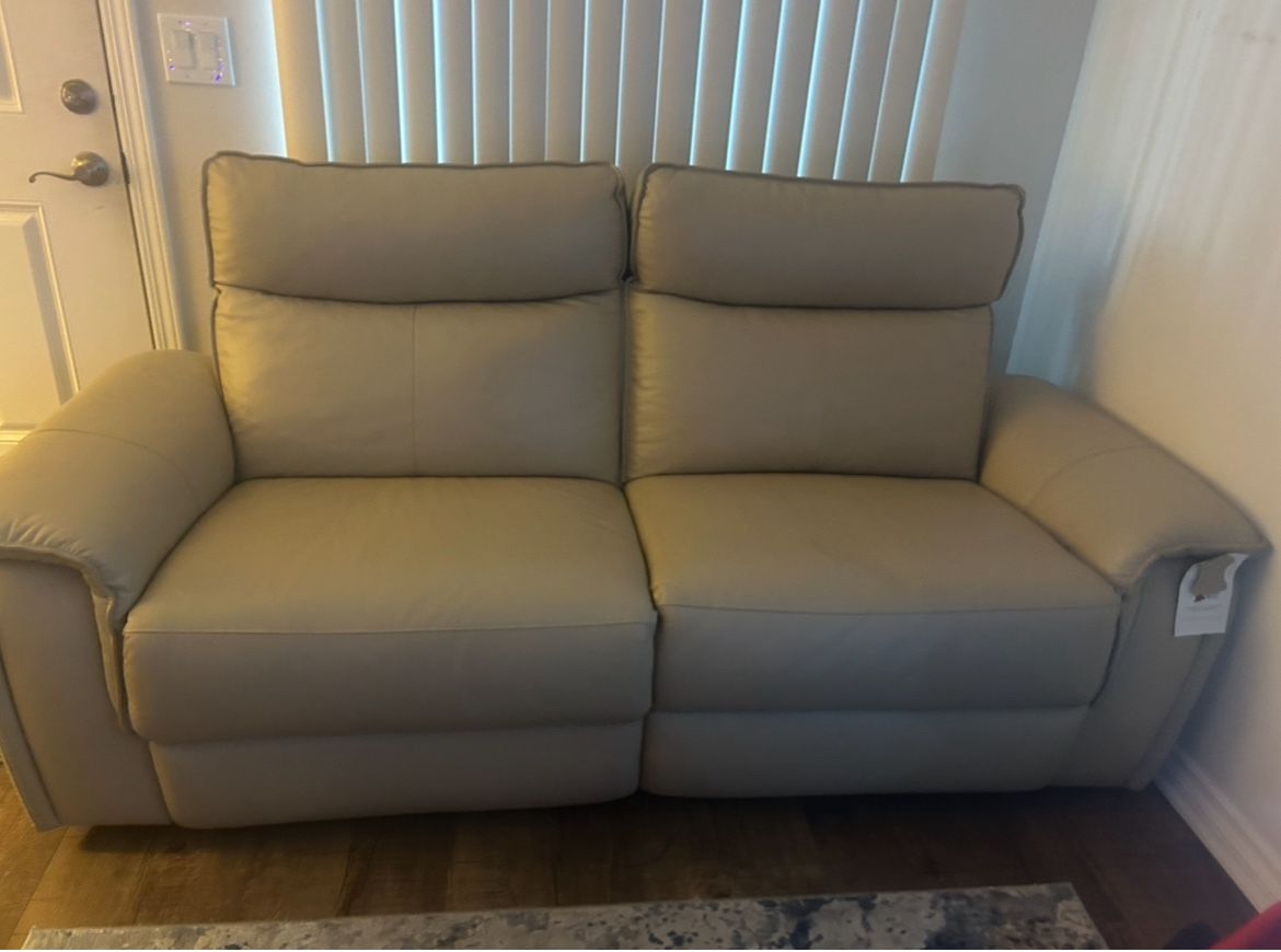 New leather sofa it's brand new with tag it didn't fit in my home, it has the seats electric recliner I have to sale it comes with a cup holder and it has a small storage box to keep tv control or anything you want Original price was around $1800 hundred I am selling it for $1,000 best offer takes it first come first served