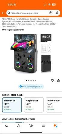 RG36PRO Retro Handheld Game Console - Open Source System,3.5"IPS Screen,30,000+ Classic Games,64G TF card, 3000mAh Battery,Portable Console for Teen or Partner-Gift for Christmas -Black