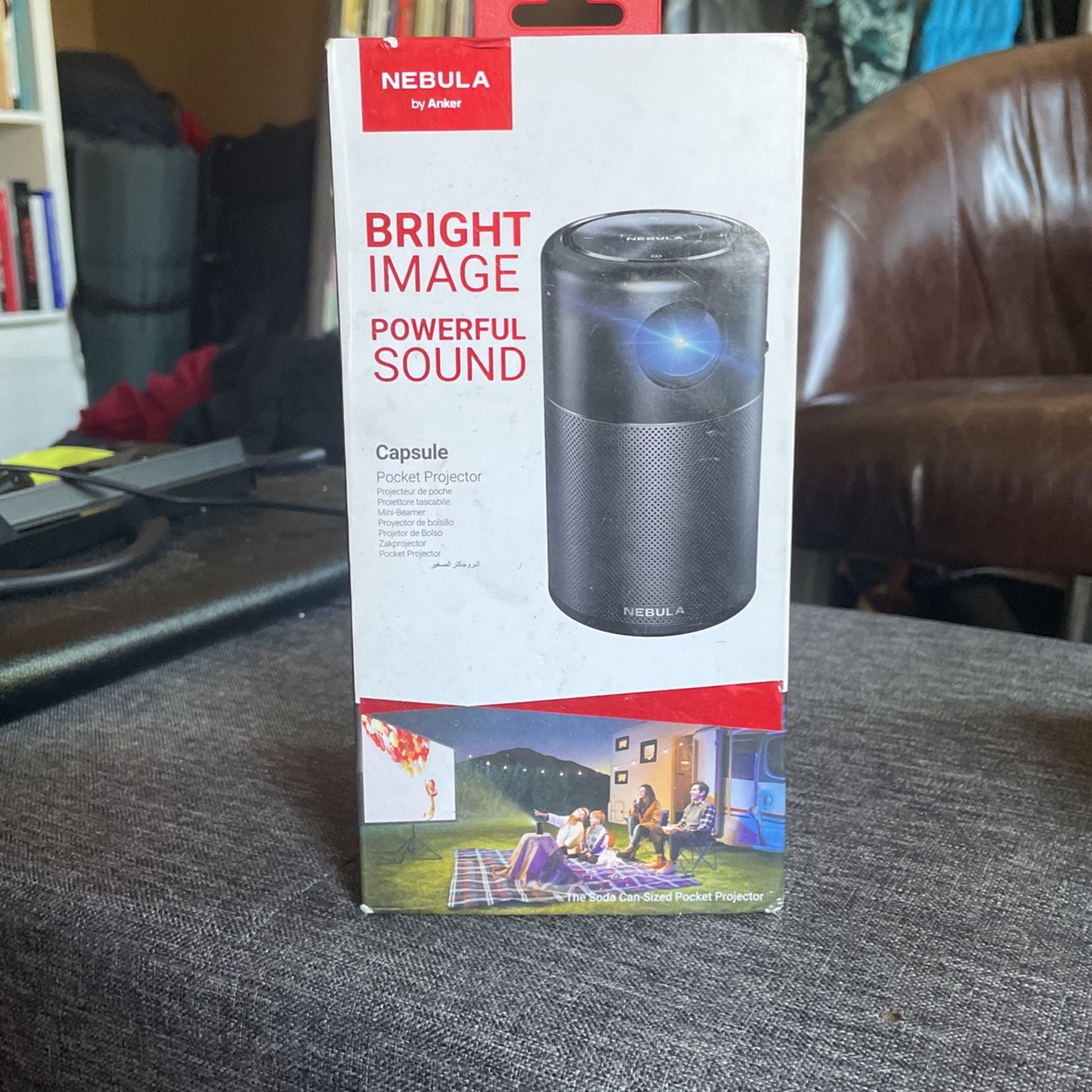 Nebula Capsule pocket projector. Works great, no issues. Works with Iphone, Android, HDMI, Bluetooth, Miracast, USB OTG. 4 hr playtime when not plugged in. Comes with 100 inch, 16:9 projection screen that can be held up with command strips, rope, or ties.