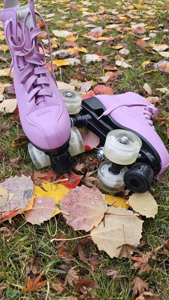 Womens size 8 Like new, my daughter never really used them. Just rolled around inside the house a few times. We'd have dogs and there is a little evidence of that from her socks.