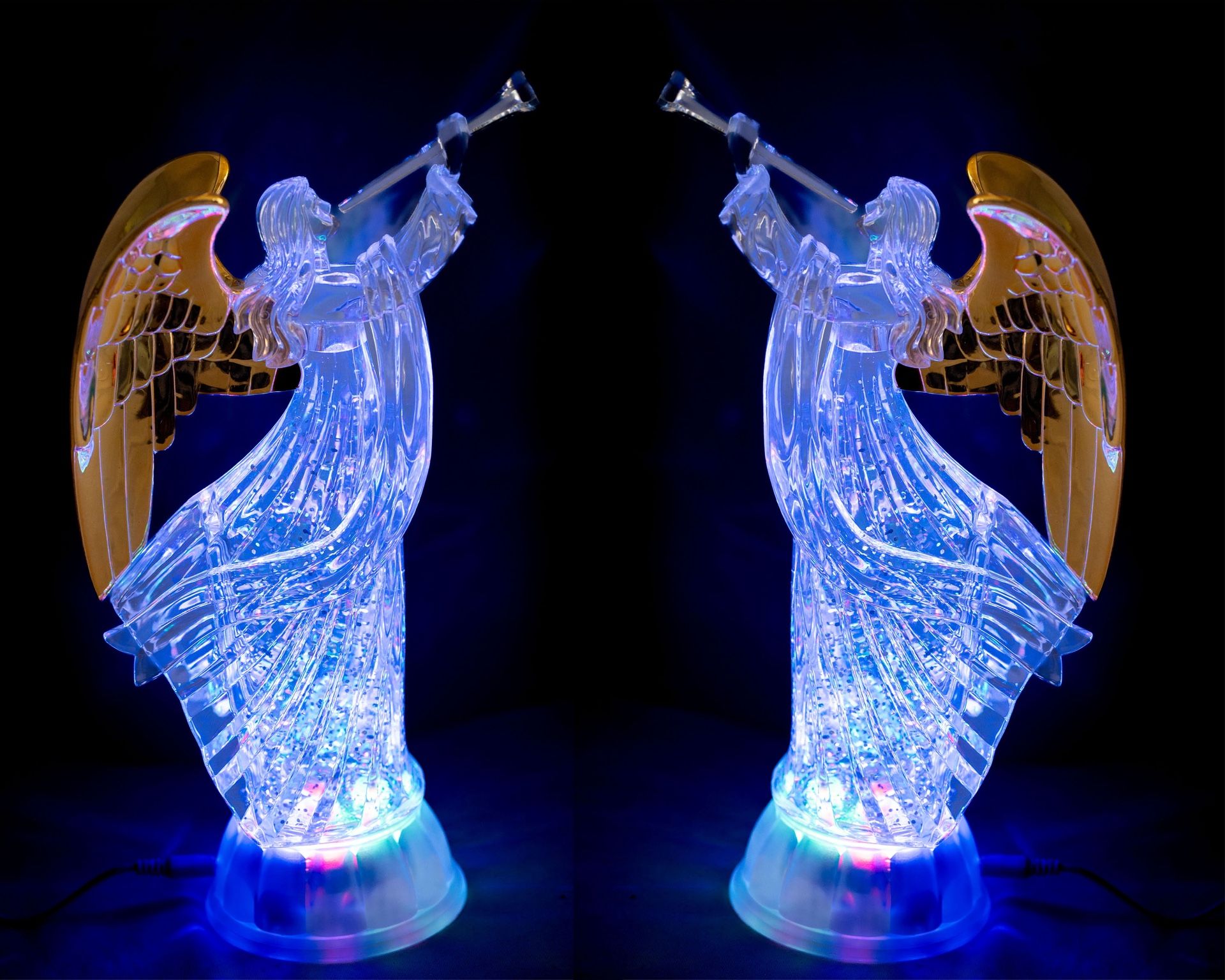 Angel Statue Fairy Wings Home Decorative Figurine Faith Hope Love Peace Guardian Angel Ornaments Snow Globe Gold Wings Angel Trumpet Figurines Statues with LED Light Christmas Decoration Gift Friend Eye Accessory Switch Shelf Window decor Dalax- Pair of Angel LED Lighted Sparkling Color Changing Snow Globe Water Lamp with 6 Hour Timer, 12'' Trumpet Prayer Angel Swirling Glitter Golden Wings Statue Home Decor Figurine, Gift Ornaments Decorations DIMENSION: 12 Inches Height and 3 inches Width. New and improved design with Electric ( One meter USB cable is included) or Battery ( 3 AAA batteries are required but not included) dual operated to light up with a 6 hours timer function. After six hours, it will be turned off for 18 hours.Package Includes: One Angel Statue and 1 USB cables are included with this and Batteries are not included. ANGEL DECORATIONS: Made of Acrylic, Eye catching sparkling detailed home/office decor/decoration featuring LED lights.Symbol of peace, love and good luck, and having this sort of statue is believed that so many positive energy comes in life. UNIQUE GIFT IDEA: Give this as a gift to mom, grandma, sister, aunt and or friends. It can also be used as a memorial gift to remember a special friend or family member.DECORATIVE USES: Makes a great accessory for any occasion decor application. Give as a gift or display as a tabletop centerpiece, on a fireplace mantel, shelf or window decoration. FINE DESIGN: detailed figurine ,and great collectible decor for Living room, Bedroom, Office Decoration Golden Wings: Beautifully designed angel trumpet statue with golden wings. This angles figurine beauty is added by outstretching golden color wings which represents messengers of god. Having this angle statue connects our spirit to heaven. Elegant design lighted angel trumpet snow globe led light Christmas gift ornaments home, office, kitchen, patio decor. Beautiful and elegant appearance when light up. Battery Or Electric Dual Operated: This Angel trumpet snow globe light can be light up using Batteries ( 3 AAA batteries are required and not included with this) or Electricity ( 1m USB cable is included). Note: Only 1m USB cable is included, not the connector. Unique Gift: This can be the unique gifts for women, friendship gifts, sympathy gifts, memorial gift, gifts for mom/grandma, Thanks Giving, Holiday, Christmas, New year, Birthday or any other occasions. Timer Function: Color changing light up Angel snow globe has a timer function. Simply turn on the switch at the bottom, and it will turn on for 6 hours and after that it will automatically turn off for 18 hours. Note: If you need to turn ON more than 6 hours after turned off then please turn OFF switch first and then turn ON the switch and it will continuously turn on for another 6 hours.