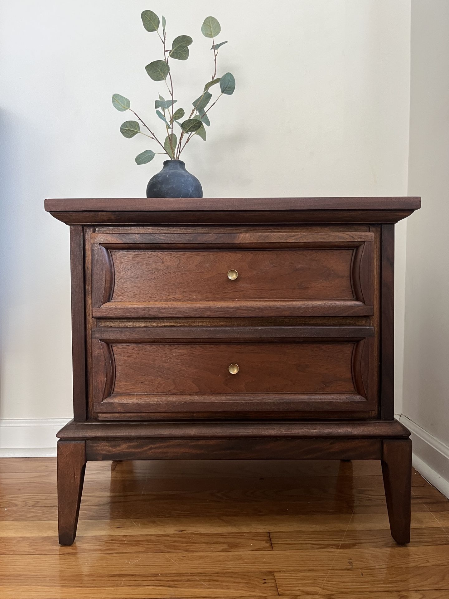 Absolutely stunning vintage Dixie nightstand with rich walnut wood tones and timeless design. This piece has been beautifully refinished and is ready to elevate any bedroom or living space. ✔️ Solid wood construction ✔️ Two spacious drawers with smooth glide ✔️ MCM Brass knobs ✔️ Classic mid-century inspired silhouette ✔️ Warm, deep wood grain with beautiful character Perfect as a nightstand, end table, or accent piece. Price: $225 obo Pickup in Newtown, CT Delivery available for an additional fee, send zip code for free quote. ✨ Clean, solid, and ready for its next home!