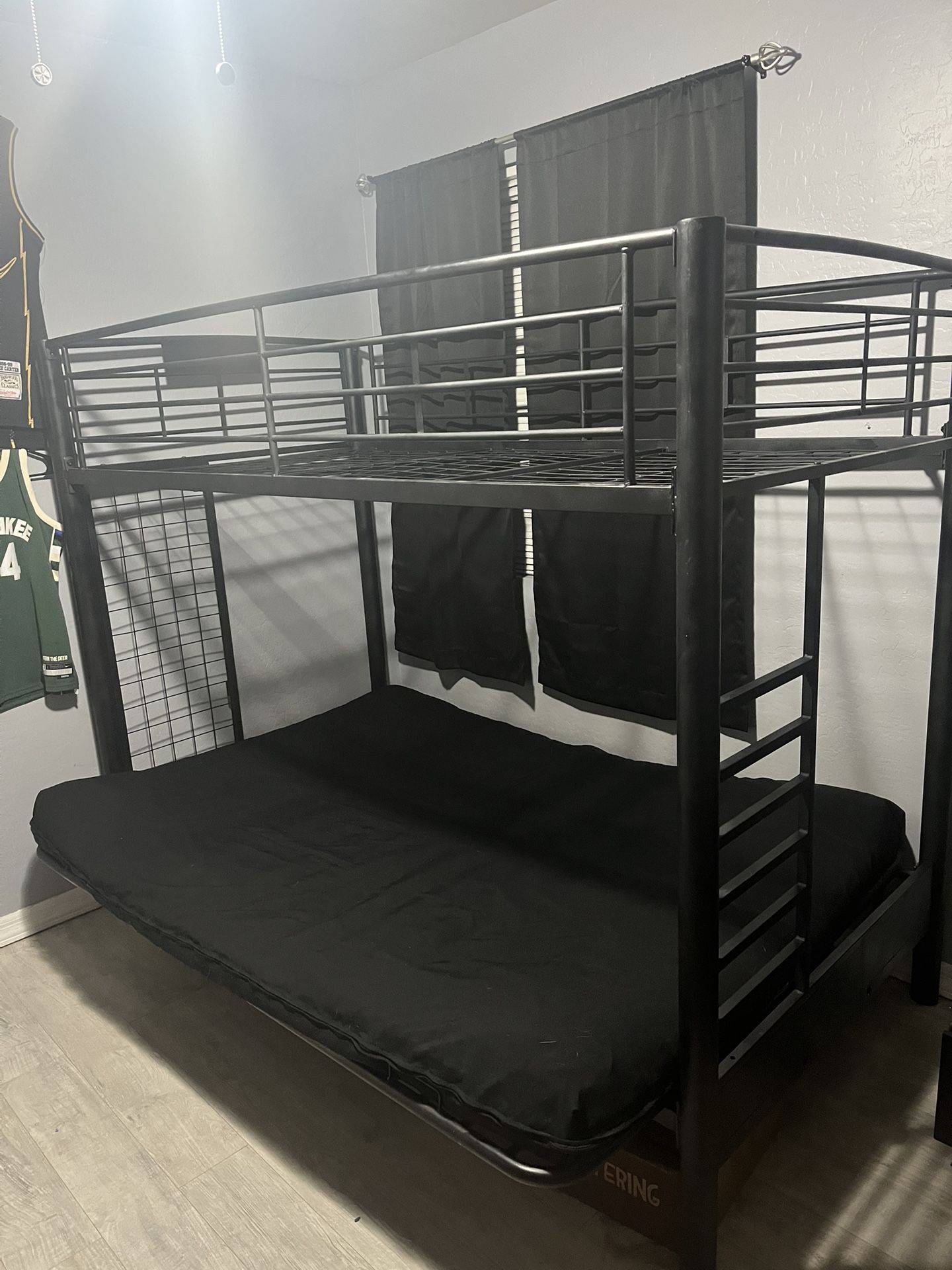 Measures 79L x 65H x 54D Futon folds into a couch. There are 3 screws that are stripped. Bed can still be assembled with them but I would recommend getting replacements from Ace Hardware, Home Depot, etc Bed frame is solid and in great condition You are welcome to take the futon mattress and I have a twin mattress for the top as well. The twin mattress was not used much as my son would always sleep on the futon (with a mattress pad). Priced to sell the frame only so the mattresses are included only if you want them. Ladder is built into the bedframe Bunk bed kids child children childrens metal