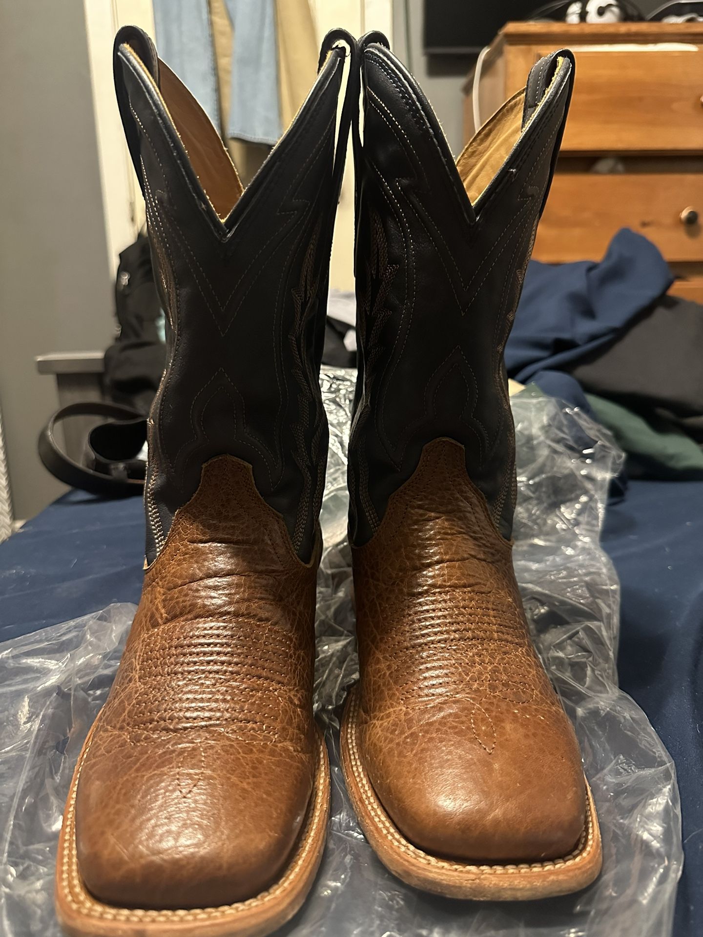 Selling tecovas bison boots size 7.5EE definitely good condition just some wear on bottom since they come shiny from factory