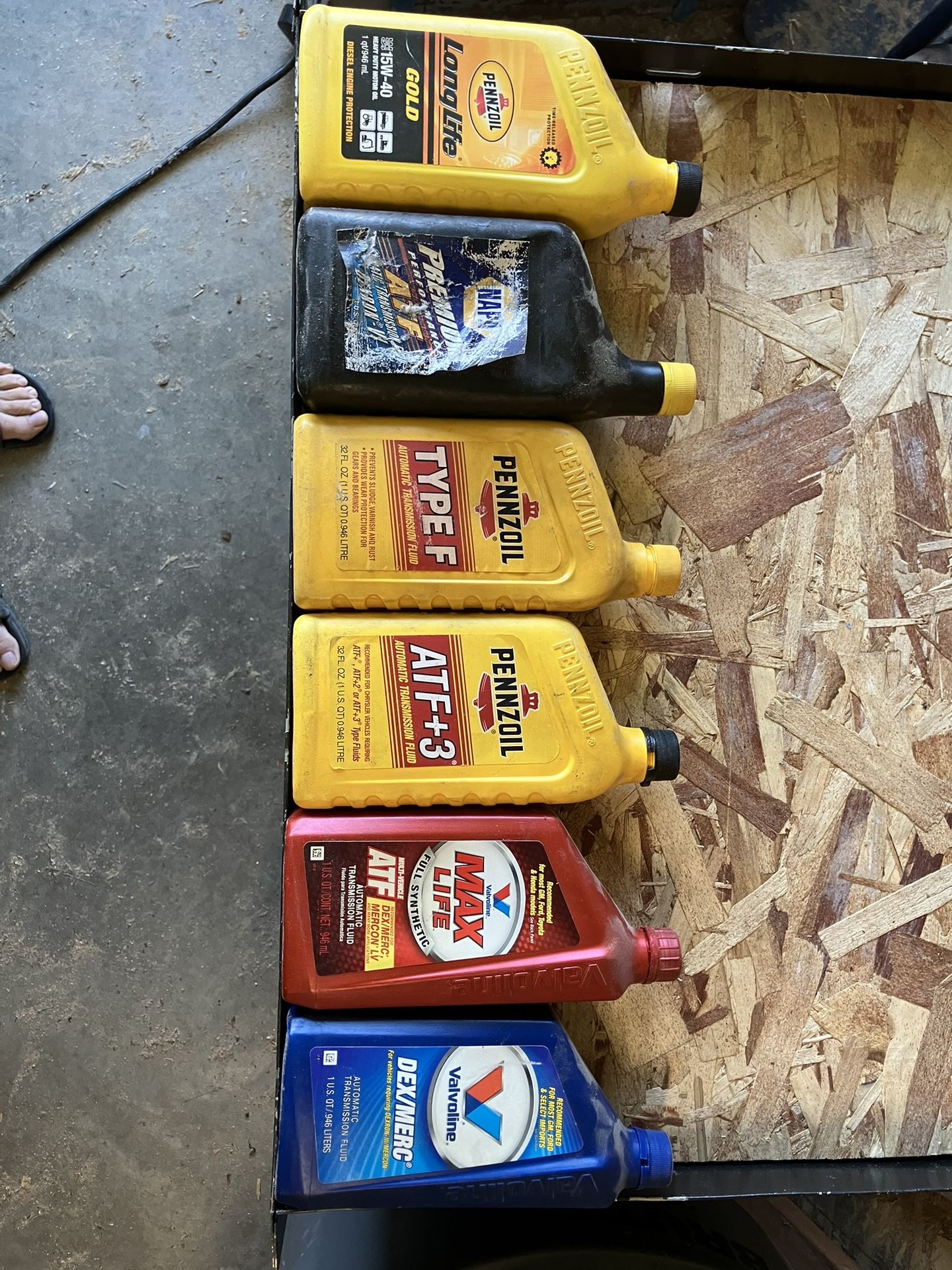 I have several brands and types of AUTOMATIC TRANSMISSION FLUIDS - (some opened and some brand new)... -AND- 1 quart of 10/40 Prices are as follows.... - Valvoline full synthetic ATF Dex/Merc LV $2.50 for a 1/2 quart left (partial) -Valvoline Dex/Merc $3.50 (unused but opened) - 1-Pennzoil ATF+3 $3.50 (unused but opened) - 1- TYPE F $3.50 each quart (unused but opened) - NAPA Premium Performance w/ DexronVI $3.50 (unopened / new) -PENNZOIL 15W-40 LongLife GOLD motor oil (75% full) $3.00 (opened and partial)