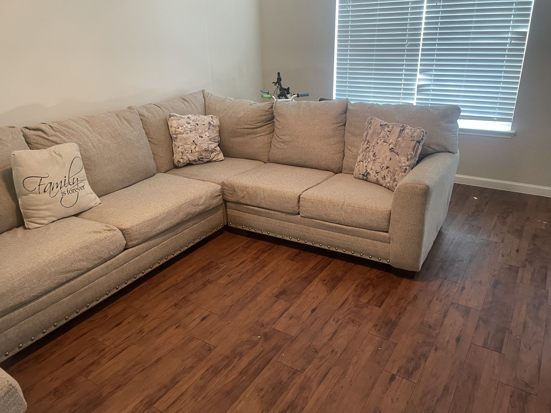 Sectional couch beige material. Only a year old. Well taken care of. No stains or rips. You must pick up and transport. $800 obo