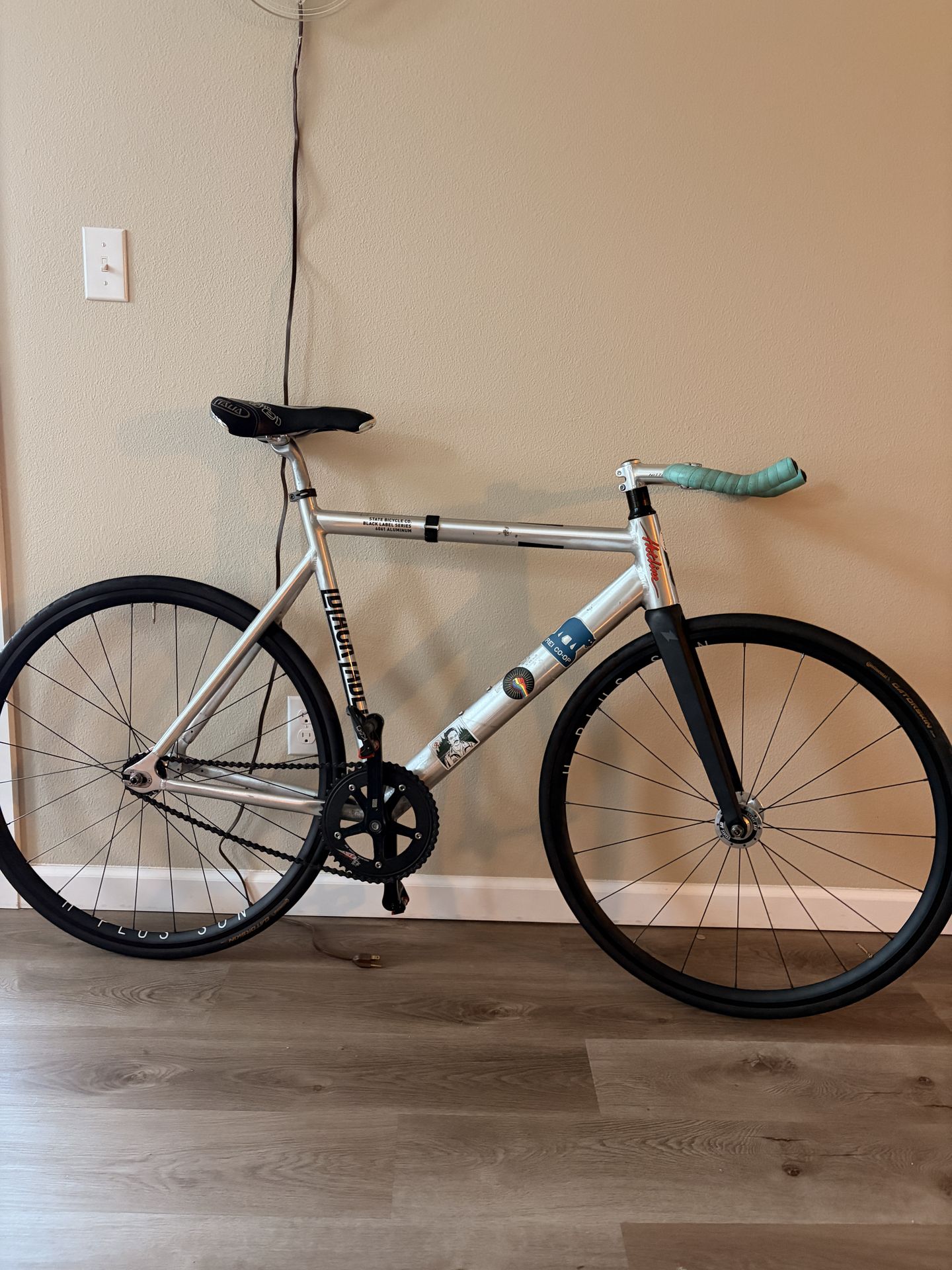 Fixed Gear. No brakes. Can’t stop. Don’t want to either. size: 58cm (large) Selling for money towards another project and to spread the fixie bug that got me into cycling. Haven’t ridden it in a couple years so it may benefit from a good once over. Specs: - State Black label v2 aluminum frameset - New (0 miles) H Plus Son wheels w/DT Swiss Hubs - Continental Gatorskin tires - 17t All-city rear cog - 49t Sugino Zen chainring - NJS Nitto cold forged aluminum stem - Easton Bull horn handlebars - Stella Italia saddle - MashSF x Izumi chain - Stock Black label cranks - Clipless pedals - Eccentric viby stickers - NO BRAKES