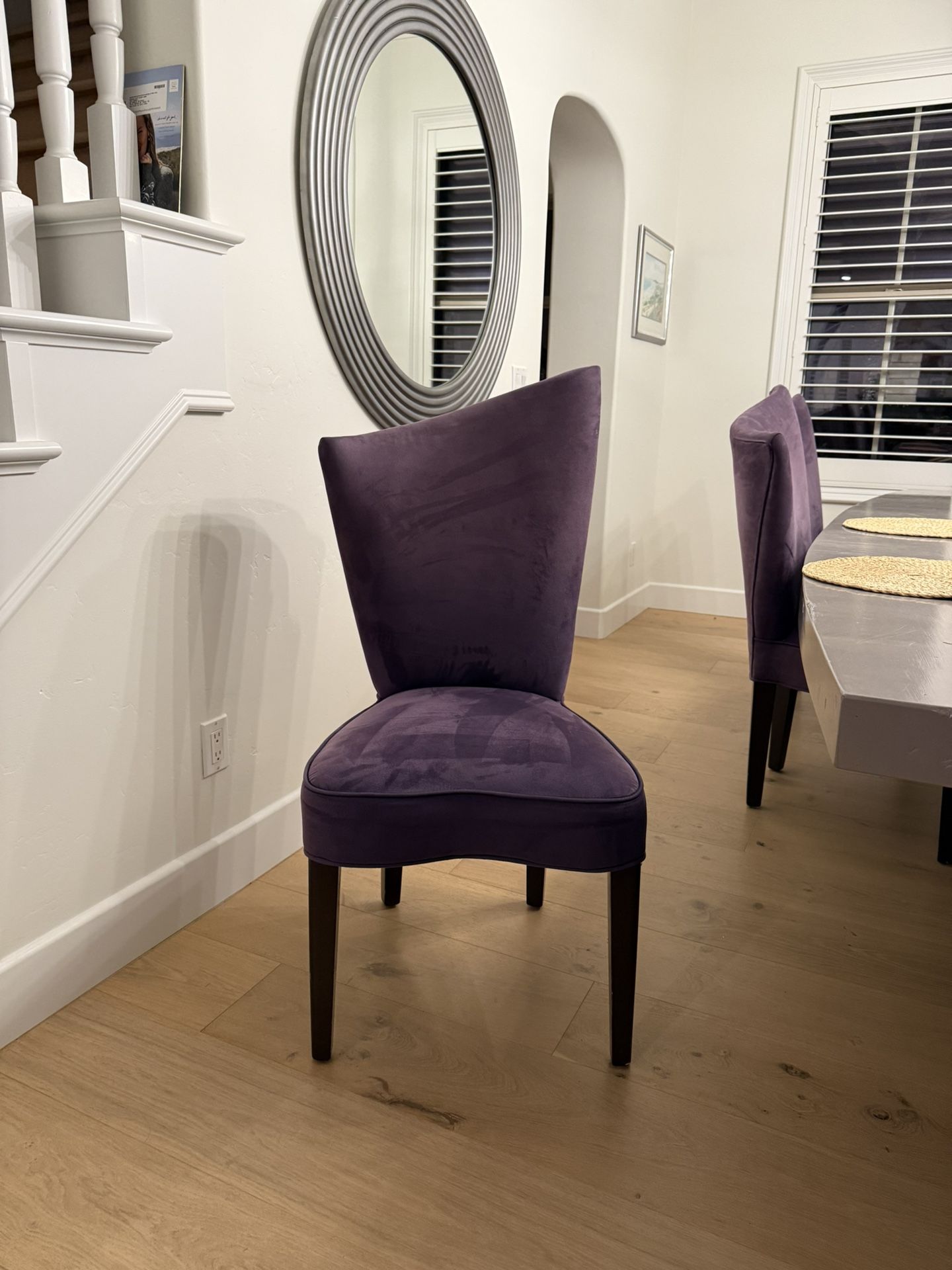 ✨ Set of 8 Cool, Modern & Comfortable Microsuede Dining Chairs in Purple—Perfect for Holiday entertaining!🍷 Set of 8 gorgeous microsuede chairs — cool modern design with unique and stylish curved back/top, soft and comfortable to sit in with a supportive back and dark wood legs. Upgrade your dining room in time for the holidays! Excellent condition, smoke-free home. $400 for the full set (that’s just $50 each!). 🎉 Ready for pickup today!