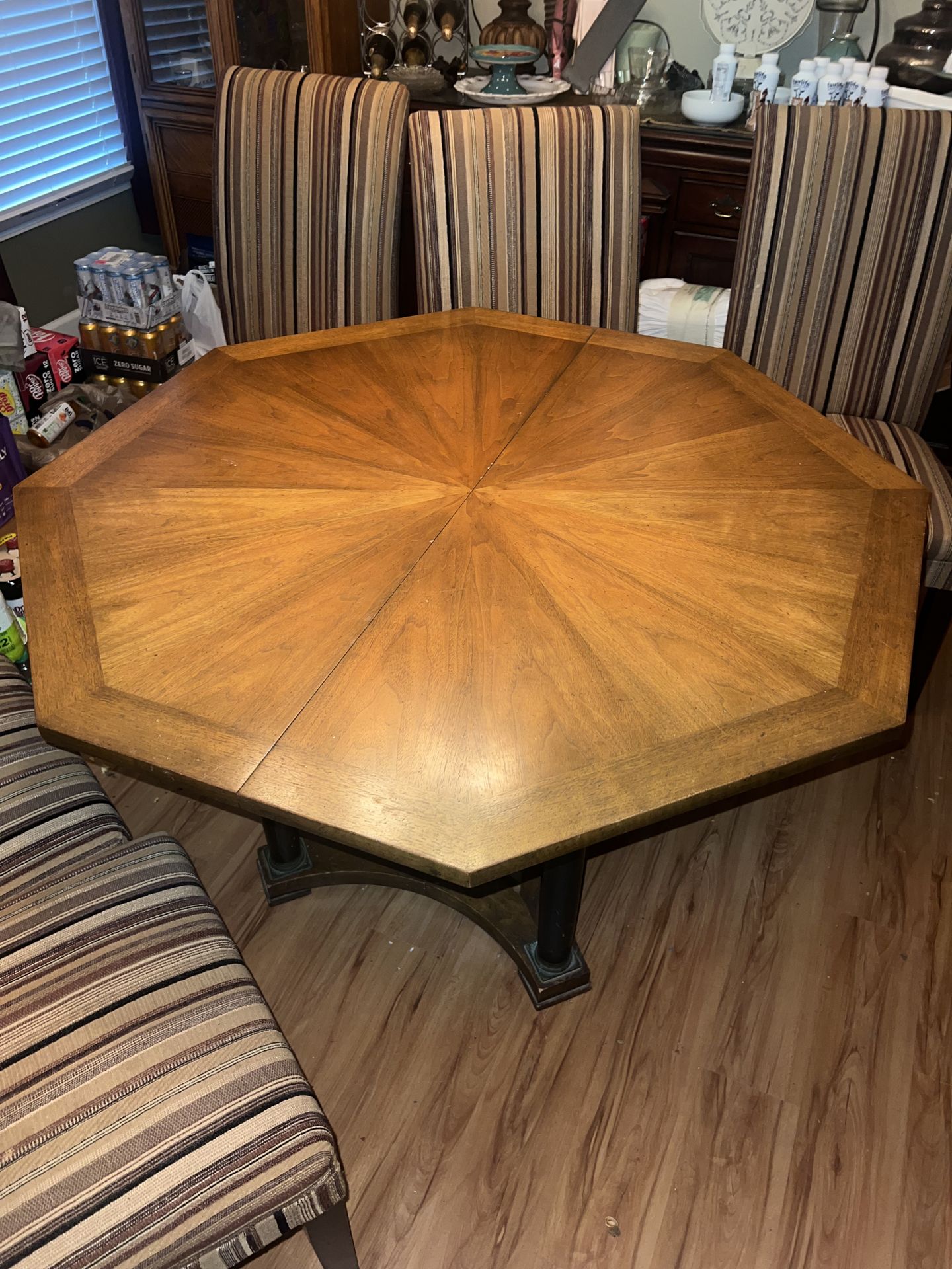 Dining table able to expand comes with 2 table extenders (leaves) and 8 chairs