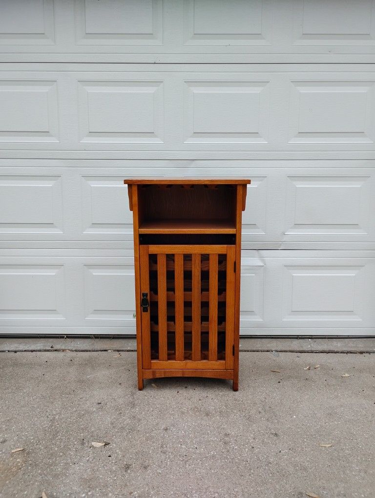 Beautifully crafted solid oak wine rack in excellent condition. This piece combines classic design with practical storage, making it a versatile addition to any home. - 40 inches tall - 22 inches wide