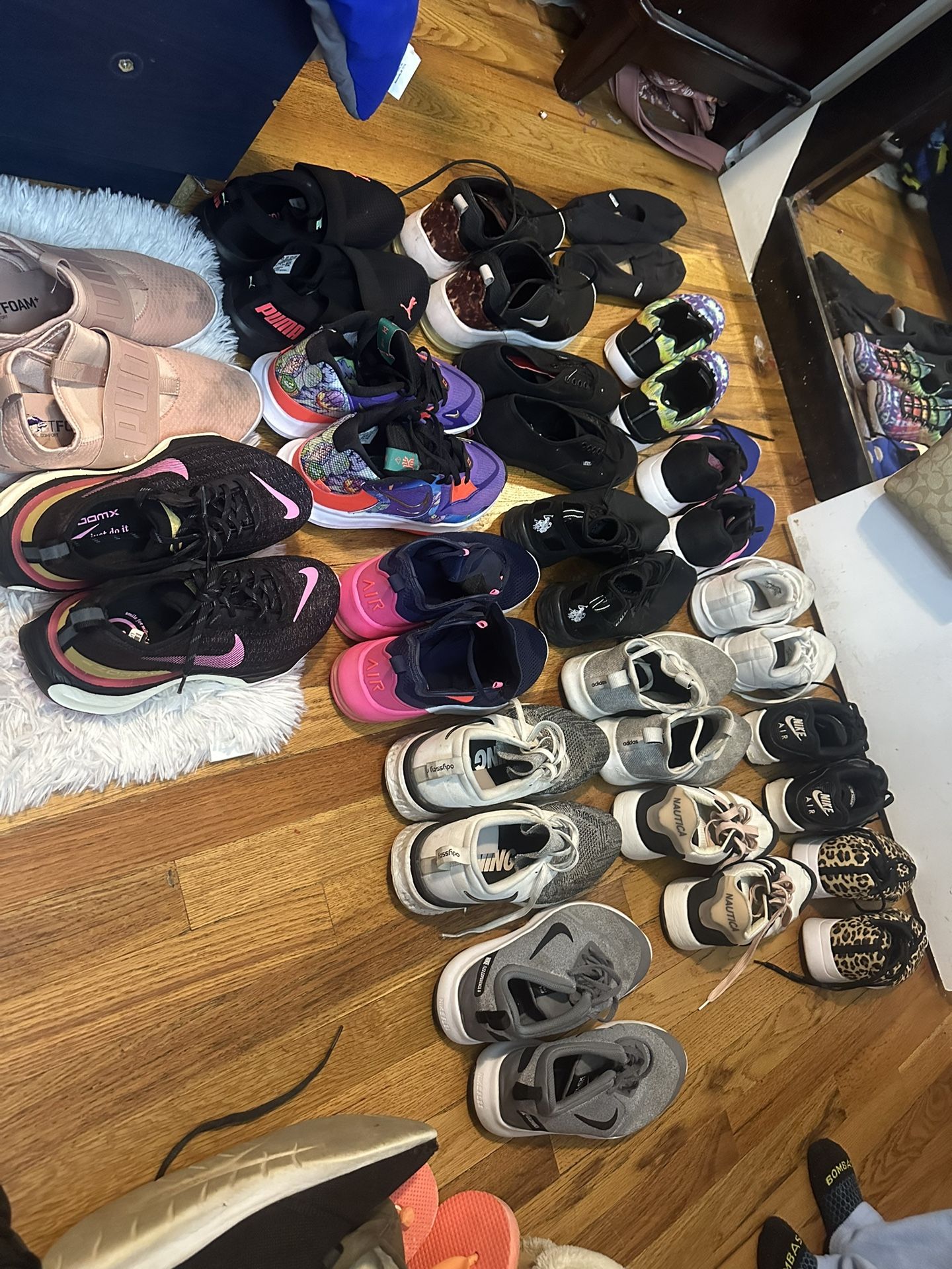 Women’s shoes a lot are brand new or only used once . Sizes are mainly 8-9