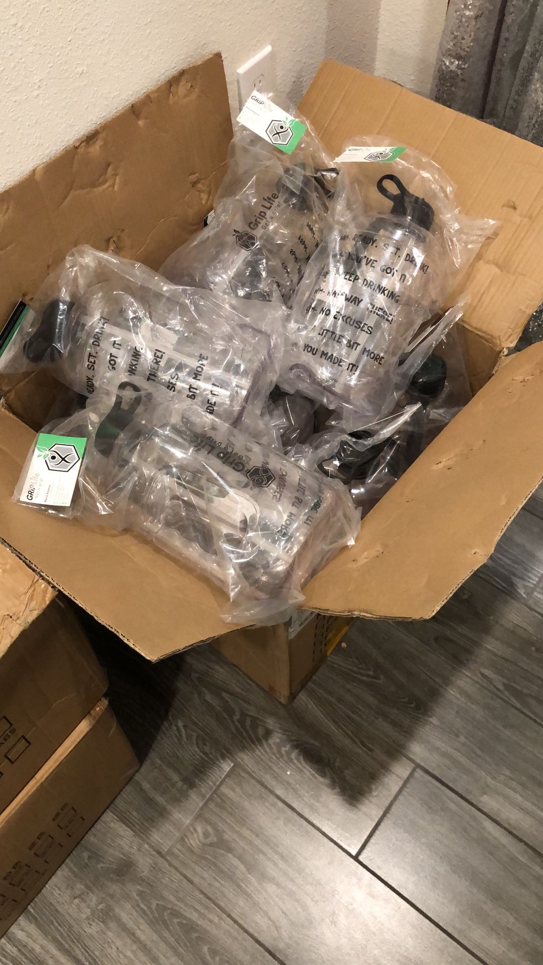 Brand New Multiple Available Doctors and nutritionists agree that the average female needs around 92 ounces of water a day, and the average male needs 128 ounces. You can get a GRIP on your hydration with this 128 ounce Motivational Water Bottle. Starting at 8am, your daily water goals are mapped out in 2 hour increments with great motivational sayings. * Nozzle with straw for easy driking * Molded easy lift handle * BPA-free * 128oz (1 Gallon) capacity * Durable nylon strap * Hand Wash Only
