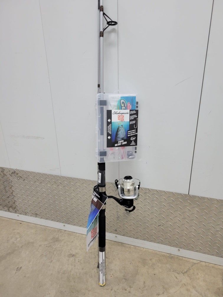Shakespeare Catch More Fish Striper Spinning Reel and Fishing Rod Combo $35 New Price is firm Rod Length 7" Number of Pieces Mono Capacity yd/lb 320/12 280/14 225/17 Rod Power Medium The Shakespeare Catch More Fish Striper Spinning Reel and Rod Combo features everything aspiring anglers need to catch stripers. Great for first-timers and as well as those with more experience, this set includes a two-piece Shakespeare spinning reel and rod combo for smooth and reliable casting and reeling. The spool is conveniently prefilled with Stern 14-pound monofilament fishing line and is ready for rigging and casting immediately. The spinning combo also comes with all the tackle you need to hit the water--including Berkley Gulp! Swimming Mullet, a buck tail jig, sinkers, fluorescent beads, and more--so you can experiment with different rigging strategies. Delivering quality and convenience at an excellent value, the Shakespeare Catch More Fish Striper Spinning Reel and Rod Combo is an easy way to equip family and friends with all the tools they need to reel in a big one