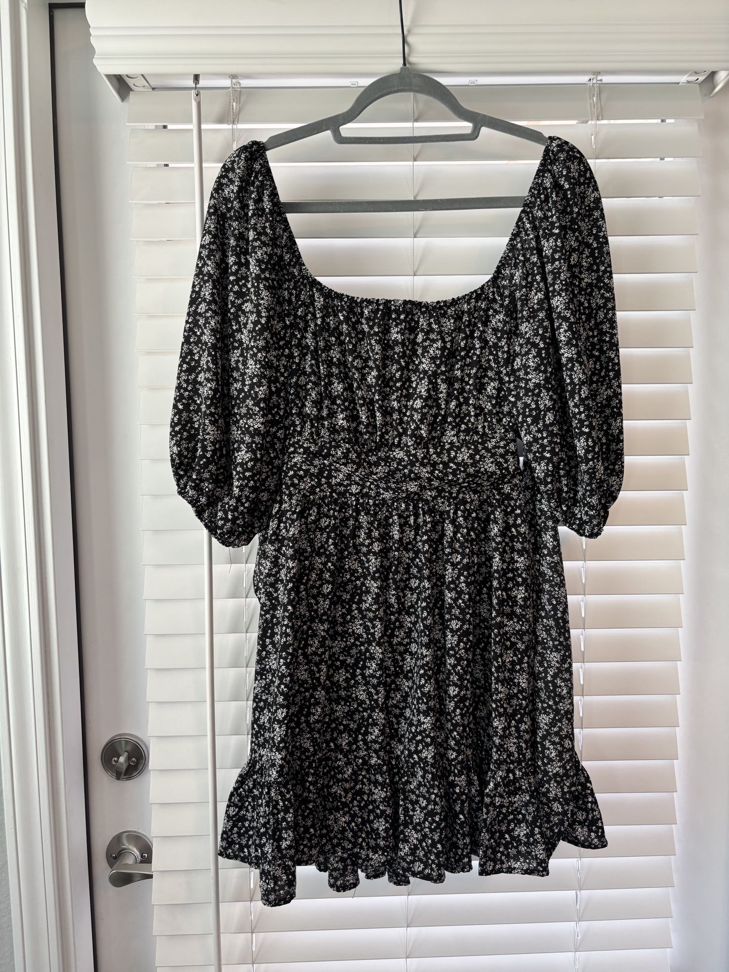 Black with mini floral white design. Mid blousy sleeve, tie bow in back.