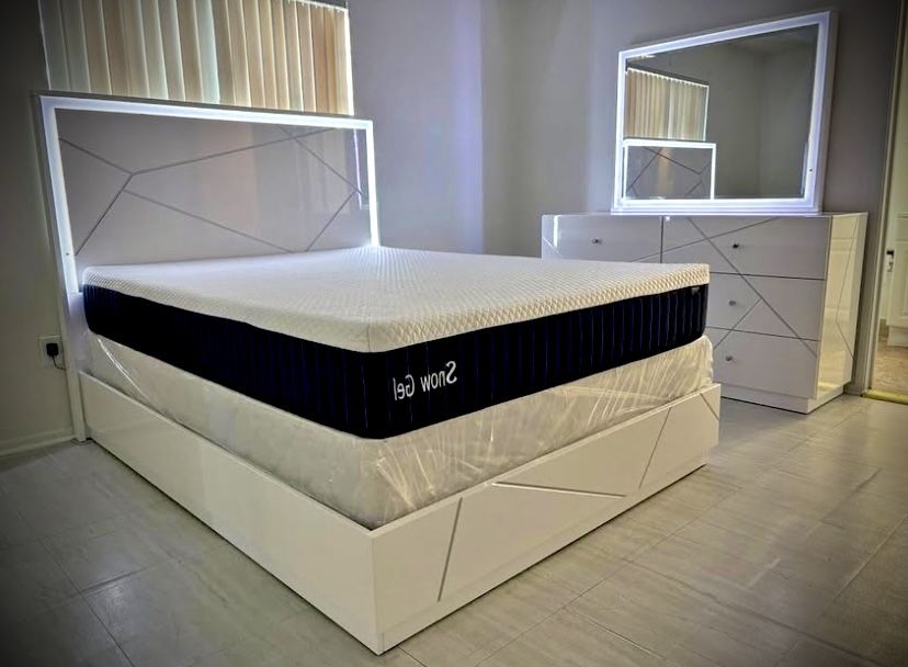 YOU CAN SEE THIS IN OUR SHOWROOM. * Included: 1 Bed, Night stand, Dresser and Mirror (Integrated LED Lights) * Material: High-Gloss Lacquer Finish * Dimensions: Easter king