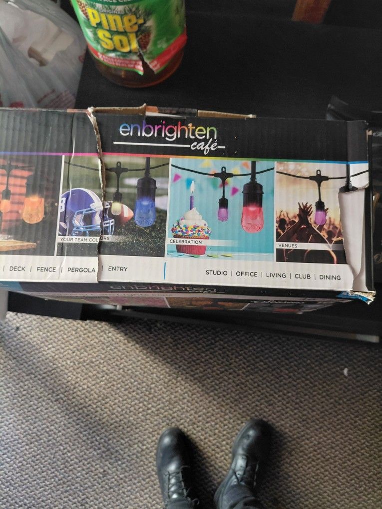 Professional patio lighting.. great deal is an open box product has never been used. These lights cost $200 at walmart. If you're looking for a professional outdoor lighting waterproof and hang on patios this is a great deal. 24 bulbs 48 ft