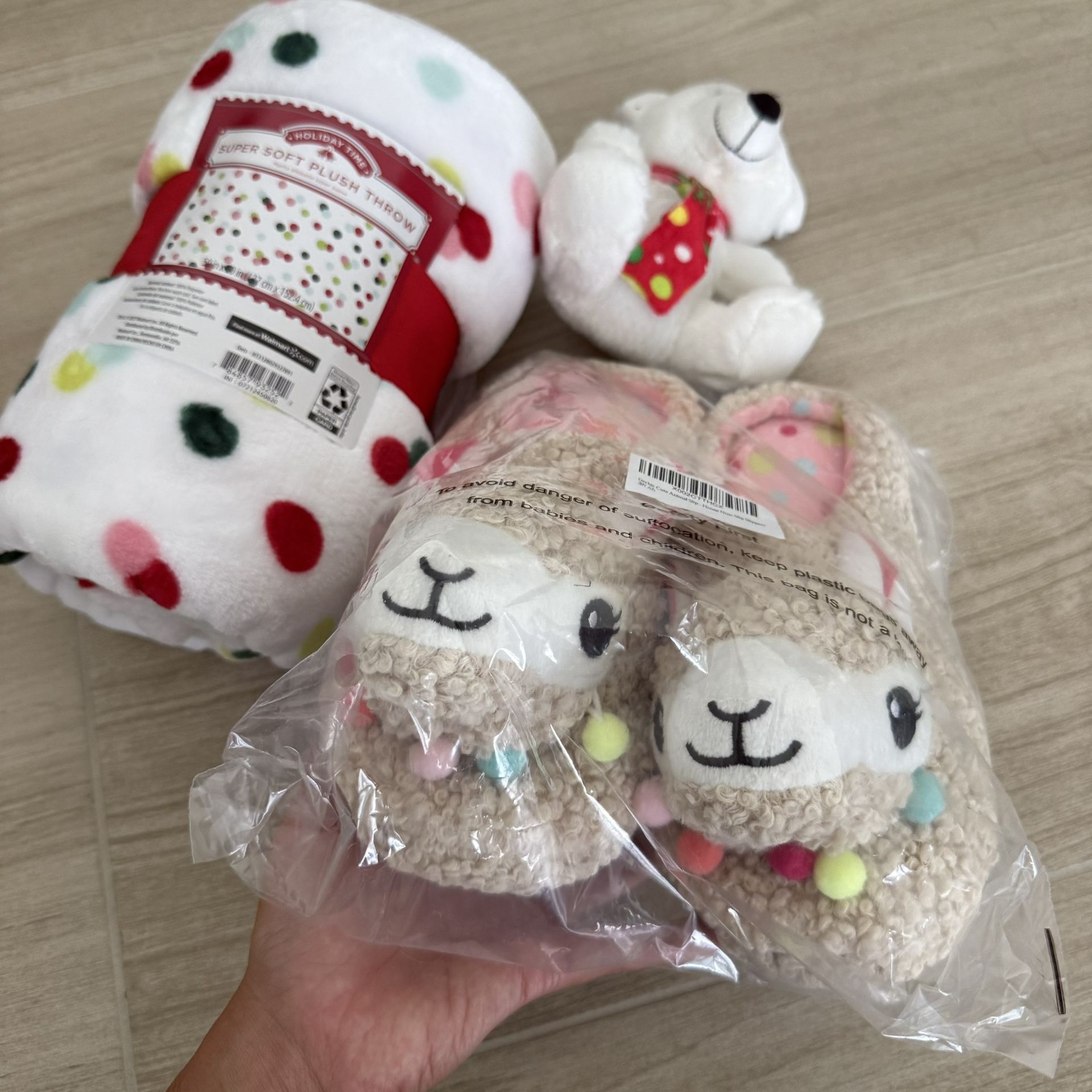 Cozy Llama Slippers 7/8 and Polka Dot Blanket Set