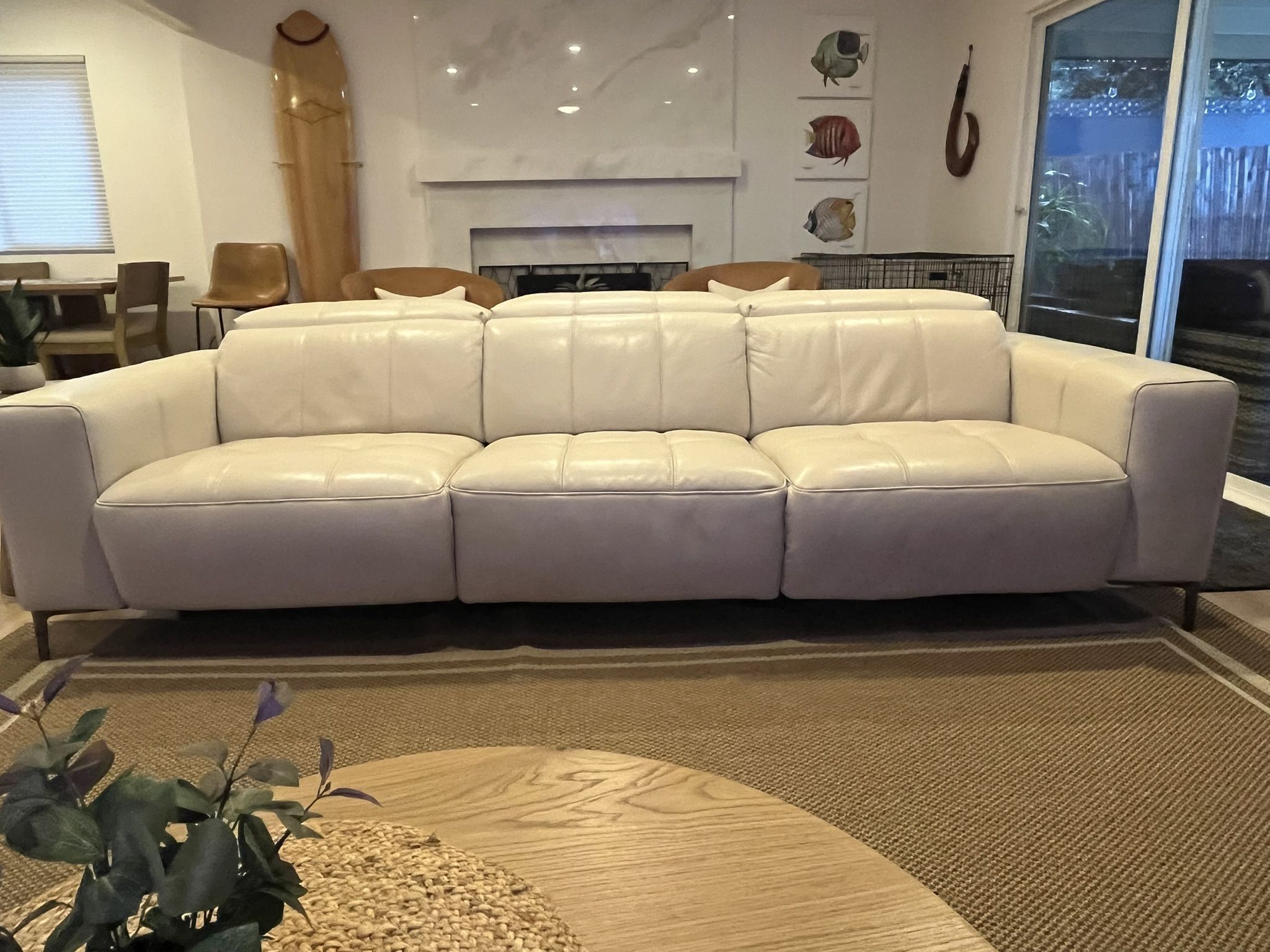 **GENUINE LEATHER COUCH. MODERN EXCELLENT/ PERFECT CONDITION. TWO END MOTORIZED RECLINERS WITH MULTIPLE SETTINGS. BEAUTIFUL BONE COLOR. 108x41. EXTREMELY COMFORTABLE. PURCHASED 2/24 $3700