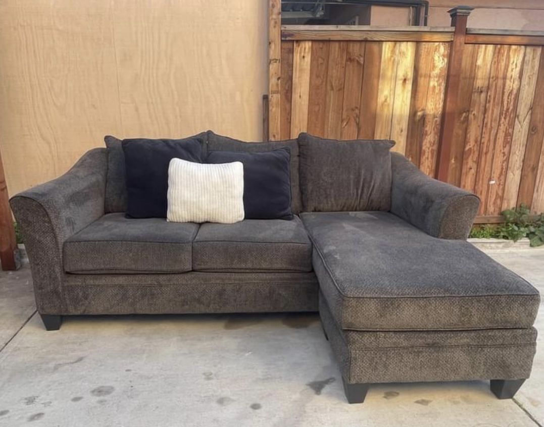 Selling My Comfy Dark Gray Modern Sectional Sofa. Comfortable Back and Seat Cushions, Smooth Fabric, Reversible Chaise, Clean. Excellent Shape. Original Condition. Made by Ashley Furniture. Dimensions: Sofa Width (95in), Chaise Length (66in), Seat Height (20in), Depth (42in), Backrest Height (33in). Pickup in 92109 or Delivery with Zipcode.