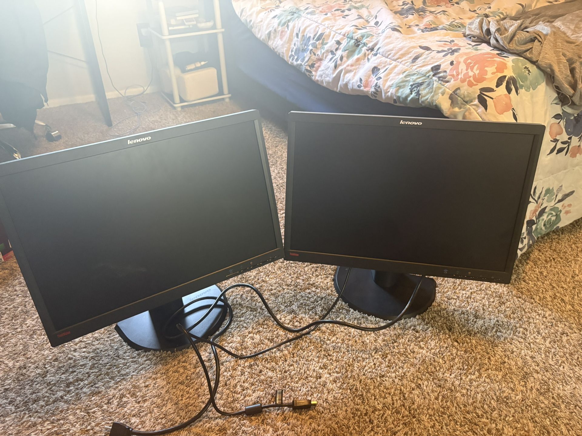18” computer monitors. Great condition and both work. Have been sitting for about a half year. Tilted screens. Only have power cord for one.