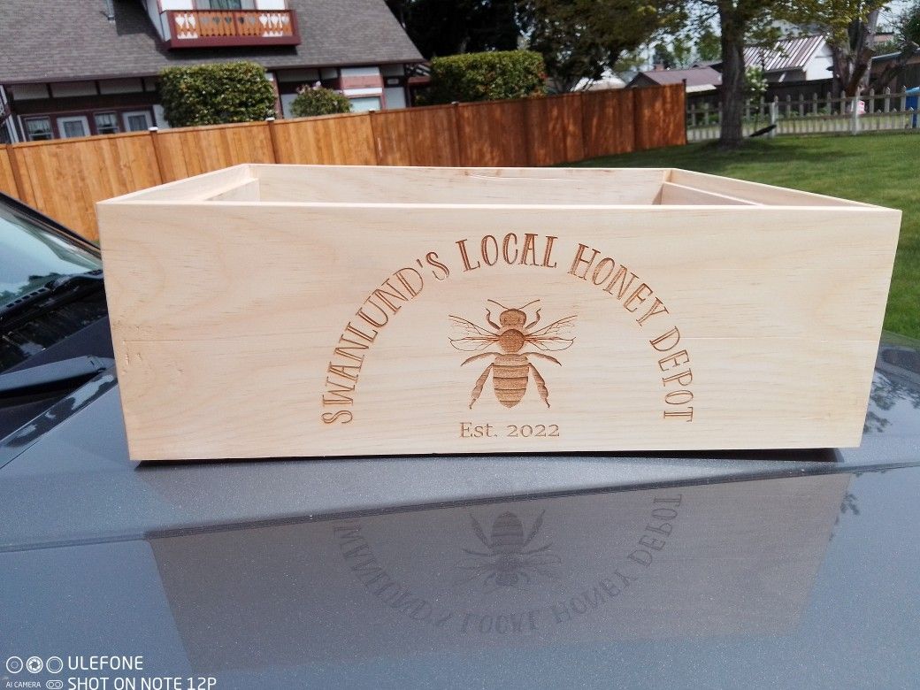 Custom Built Supers. Built with strong Lock Miter joints. Material is pine sealed with Tongue Oil. Make your bee yard booshe with custom engraving of your liking. *Boxes only $35 Shallow $45 Medium $55 Deep *Boxes with 10 frames and foundation $65 Shallow $75 Medium $85 Deep