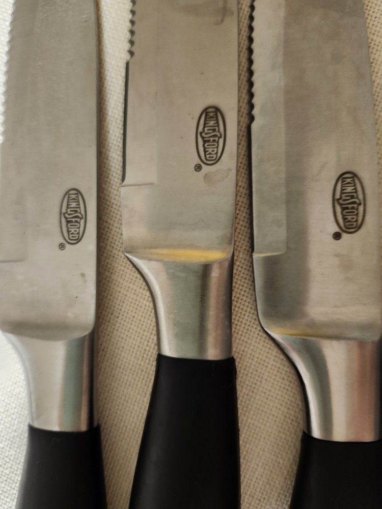 1- CHICAGO CUTLERY AND 4- KINGSFORD STEAK KNIFES. IN EXCELLENT CONDITION! Chicago Cutlery Lifetime Warranty. --- FREE DELIVERY if not too far and if buying other(s) items I have posted here--- --- ENTREGA GRATIS si no está demasiado lejos y si compra otro(s) productos aquí a la venta---