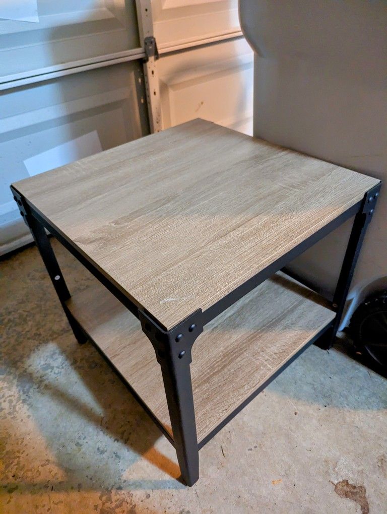 Square table Grey wash with black hardware 20"L x 20"W x 19"H In excellent shape; has a little bit of a sticker stuck on the corner; I'll treat with Goo Gone before pickup Pick up in Black Diamond (Kentlake Highlands)