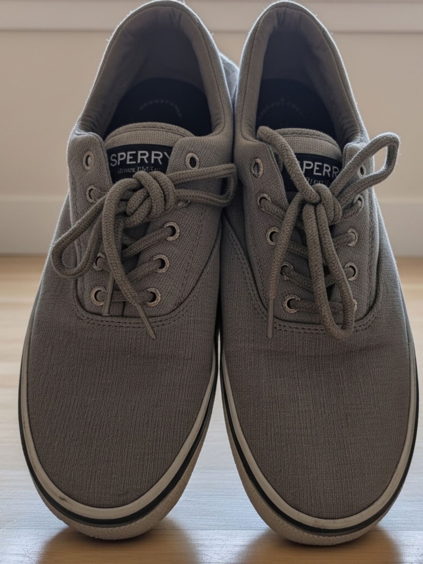 Sperry canvas sneakers, 1 from the Striper II CVO . Grey canvas textile upper with a traditional lace-up closure and signature Sperry branding on the tongue and heel. They are designed with comfort features like memory foam cushioning for all-day wear comfort. Size 11 man