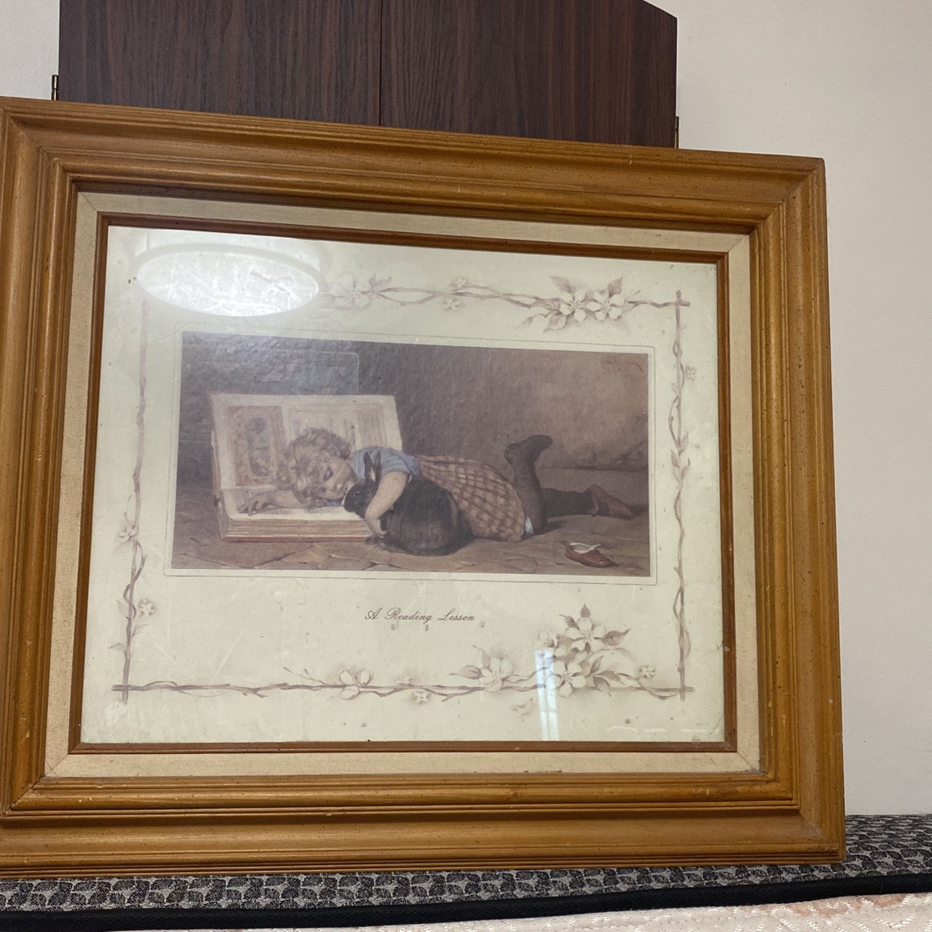 Beautiful frame with a picture of a little blonde girl that fell asleep reading a book to her rabbit