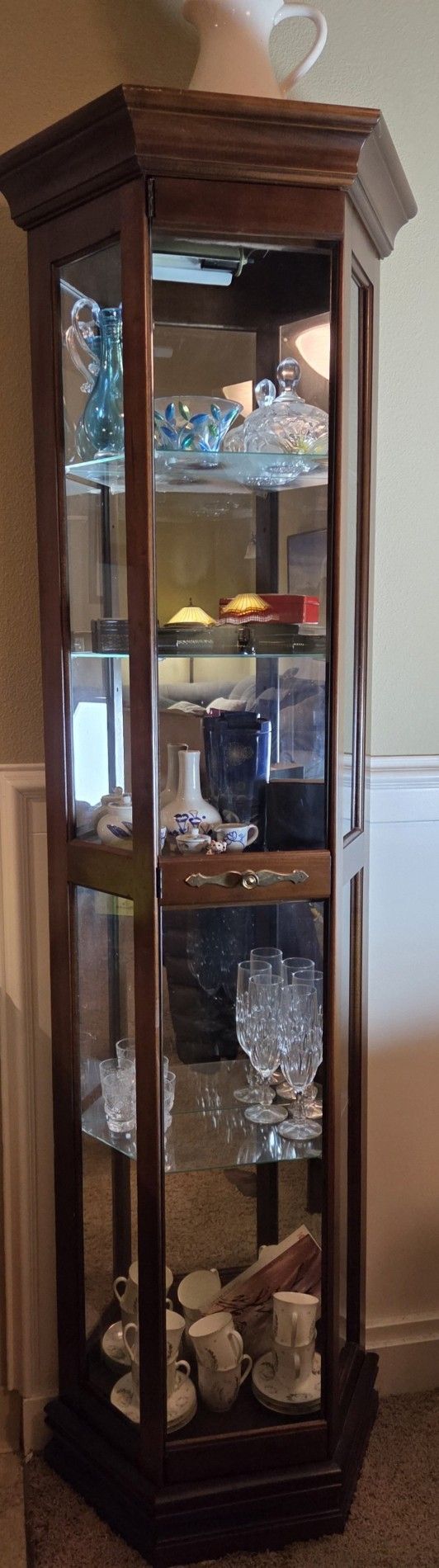 For sale: a wood & glass Curiosity Cabinet, in good-to-excellent condition. Cabinet only - the antiques shown inside not included. (although inquire if interested!) The shape is flat along the back, with a mirrored back panel on the inside, and three glass-paneled, angled sides on the front. Inside are 5 shelves (four glass, and a wooden one at the bottom) and a lighting fixture hidden away up on the interior ceiling (that we didn't realize it had until recently - unsure if it still works, but I see no reason why not) The front-most panel opens like a door and has some metal detailing. Unsure of the materials. Feel free to ask about more detailed pictures, or to inspect before purchase. Old and unique! Cash only please. Located in East Vancouver, just off of 205. We're unable to help with loading it, so consider bringing a lifting buddy. Thanks for looking!