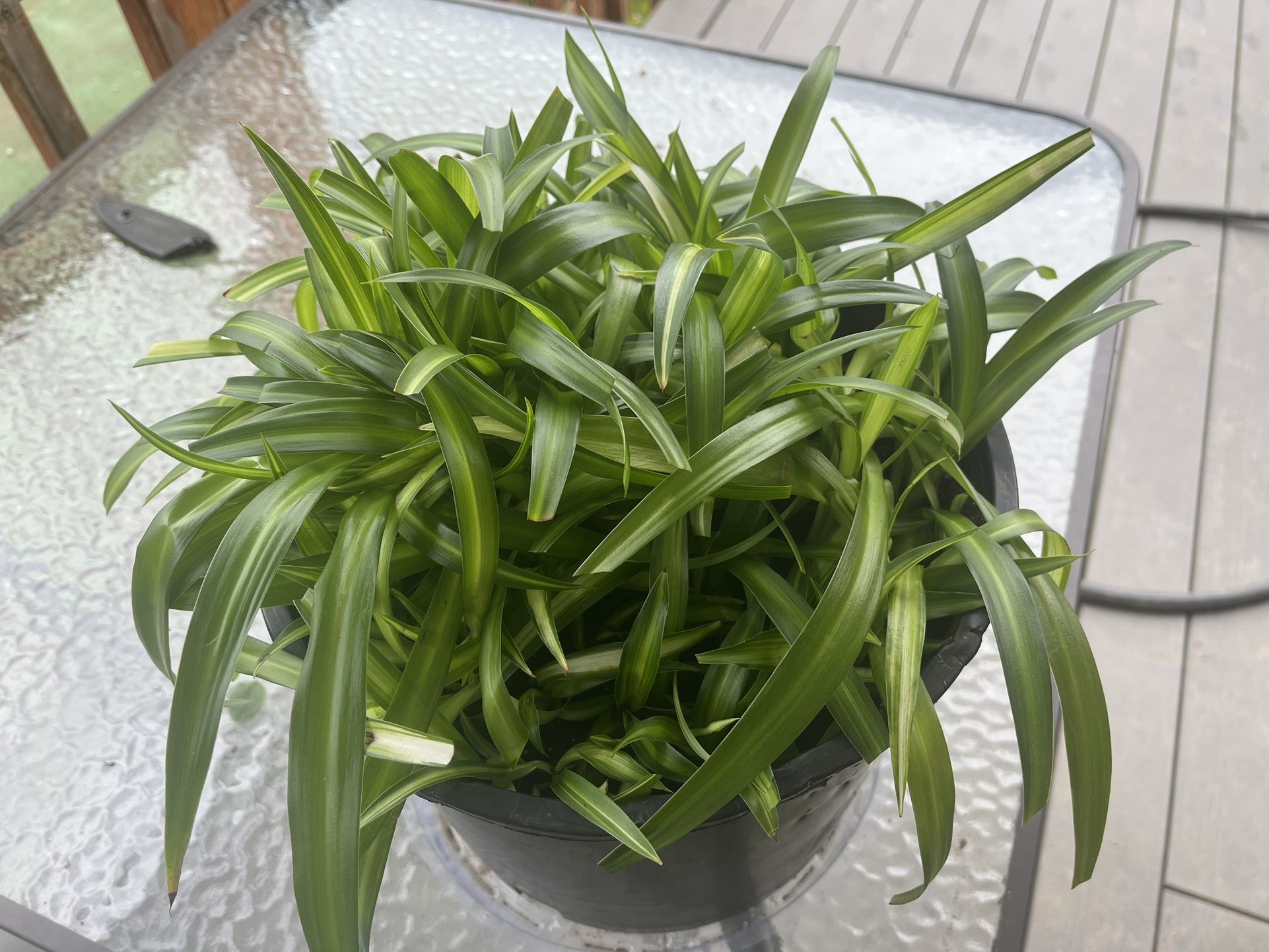 35-40 recently planted spider plant babies in a pot about 11” in diameter.