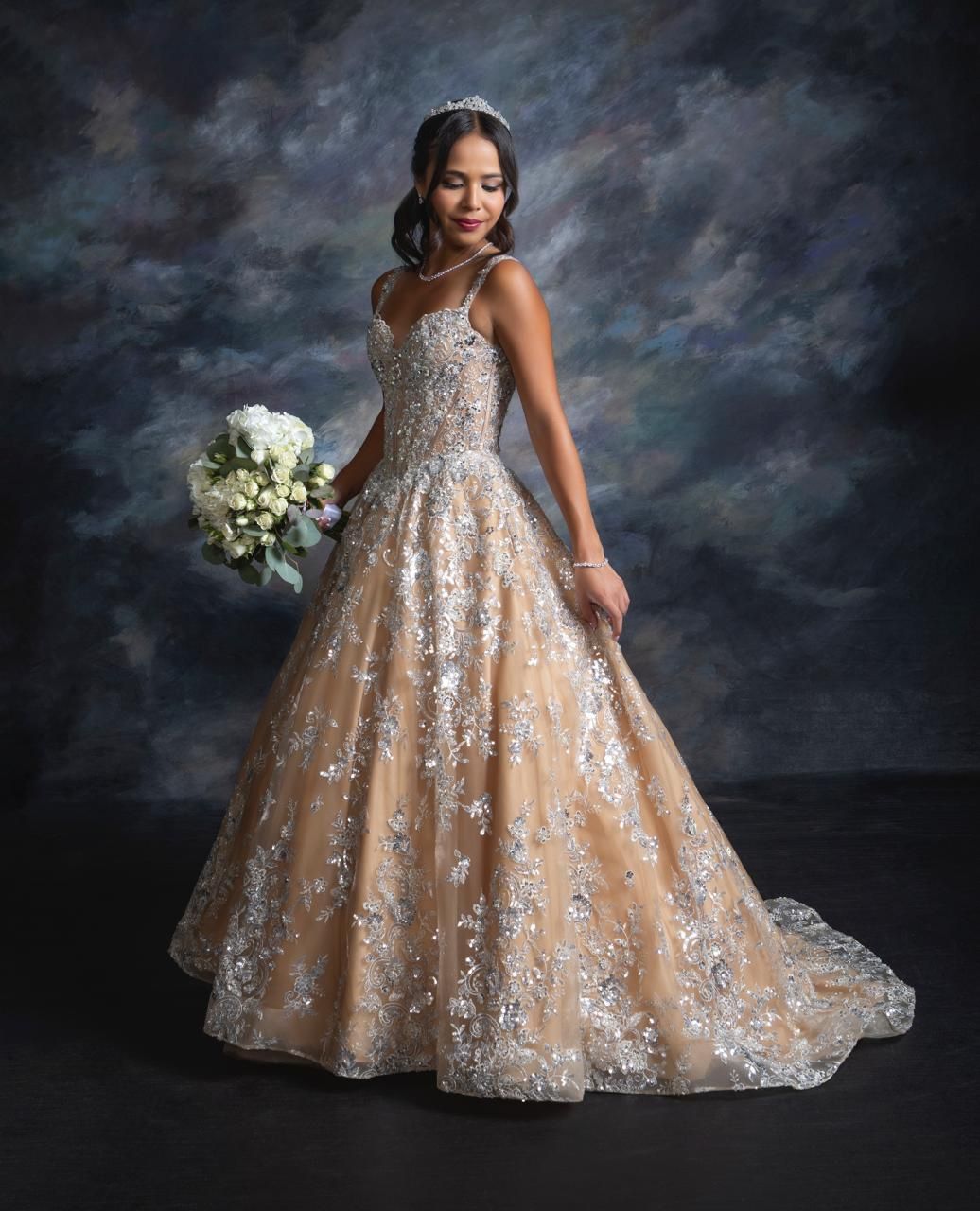 XS… fits height 5’4” wight 105 lbs. with Crinoline. Silver beading with nude color underlay.