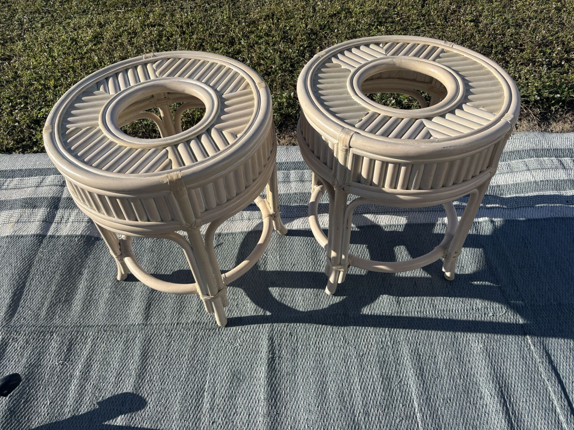 Set of round bamboo end tables.20” top and 23” https://offerup.com/redirect/?o=aGVpZ2h0Lklu great condition,nice for Florida room.$20 for both.Pickup at Lake Magic rv Resort.Four Corners area