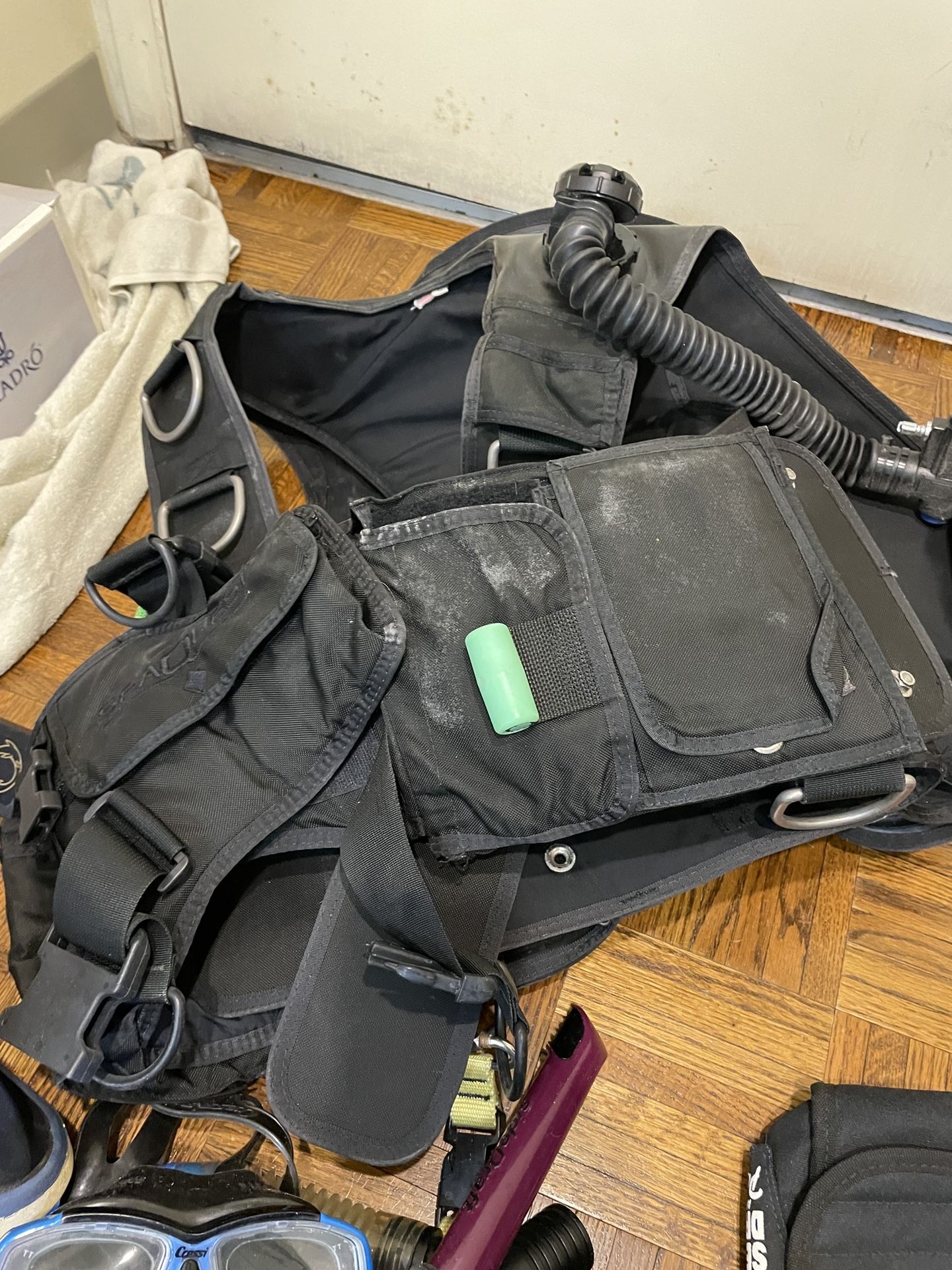 Assortment of scuba / snorkeling gear. Two sets of fins, three sets of goggles, three sets of mouth pieces. The vest is size Large. Underwater light- working as seen in pc. There are also shoes and gloves. Two large carrying bags. Used but I’m sure was working when stored. That’s all I know. Must take all. It’s available.