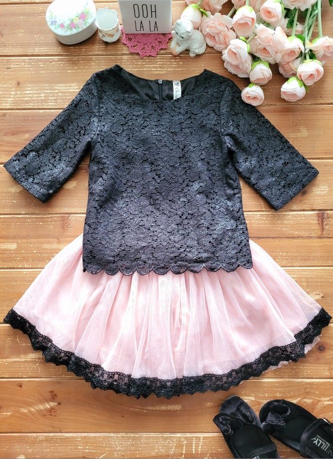 SIZE 6-6X-7 GIRLS 2-PIECE OUTFIT BLACK METALLIC FLORAL LACE THREE-QUARTER SLEEVE SPECIAL OCCASION TUNIC W/DUSTY PINK TULLE LAYER BLACK LACE TRIM SKIRT