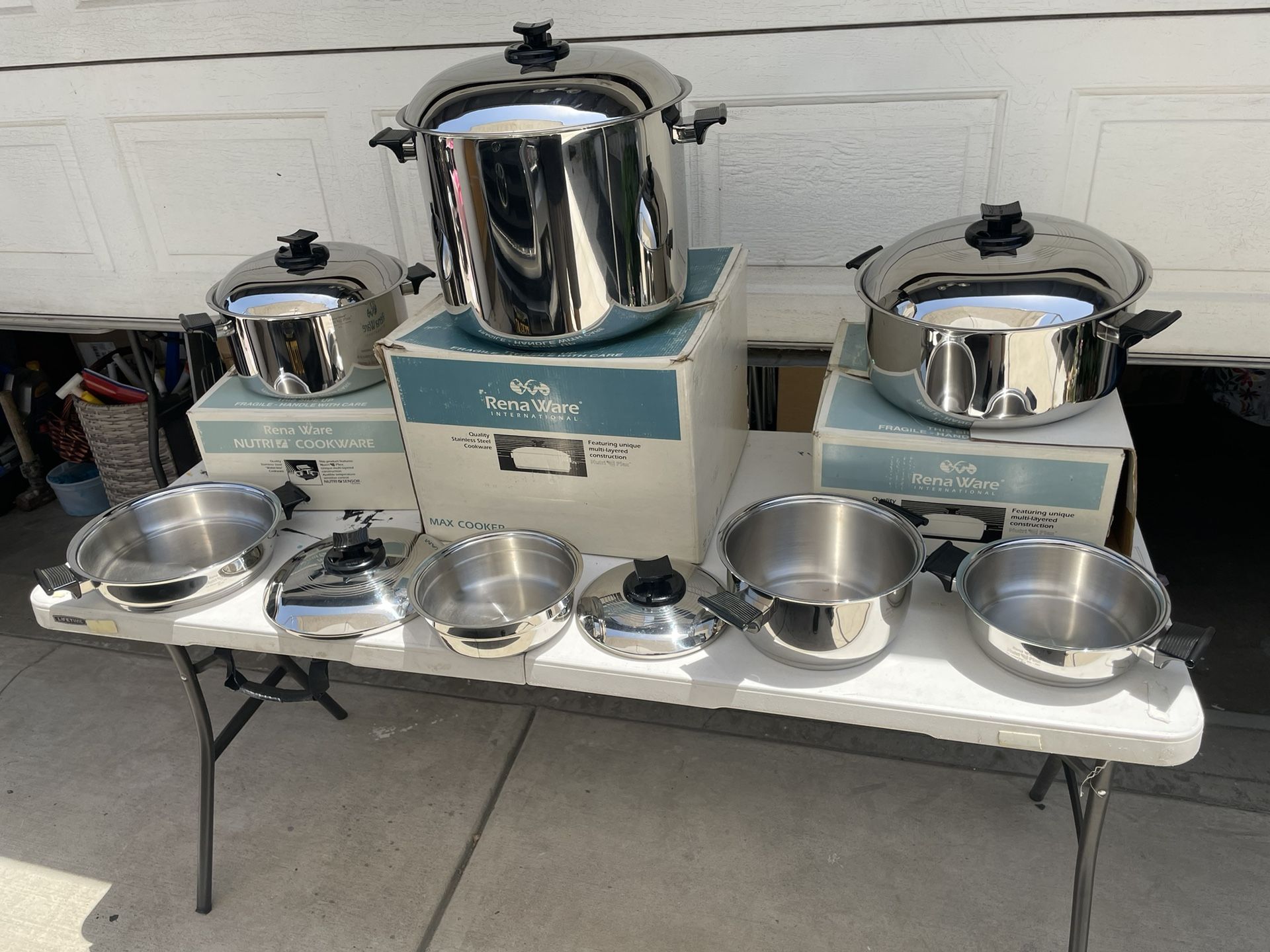 Brand New Original Rena Ware Nutri-Plex Quality Stainless Steel selling for 4600 Max Cooker 27 Liter China Induction not firm on King Cooker 12 Liter China Induction Queen Cooker: 8 Liter Nutri- Sensor by Rena Ware Waterless Cookware This product features: Nutri-Plex Unique Multi-Layered construction. Audible Temperature Sensitive Control Rena Ware Nutri-Plex 18/8 Stainless Steel 3 ply From Peru 2 Liter Pan with Lid 4 Liter Pan with Lid & Steamer 24 Centimeter Pan with Lid