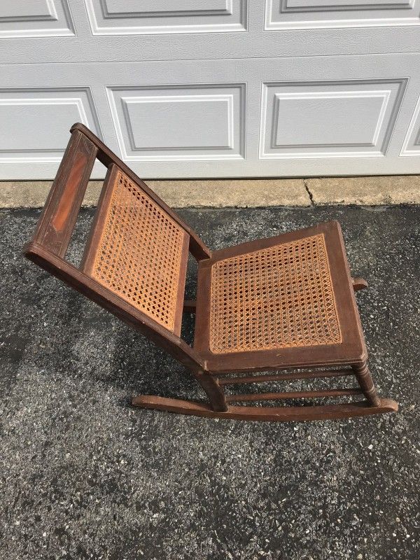 $25 OBO Super cute antique rocking chair; solid wood; and in very good condition especially for its age. Note the inlay on top of the back and the fluting down each side! A few of the rattan are broken, as shown in the photo of the seat's underside - but still works fine! Approximate Measurements: seat 17.5" wide and 16.5" deep seat is 14" from the floor back 15.5" wide and 21" high total chair height from floor to top is 31"