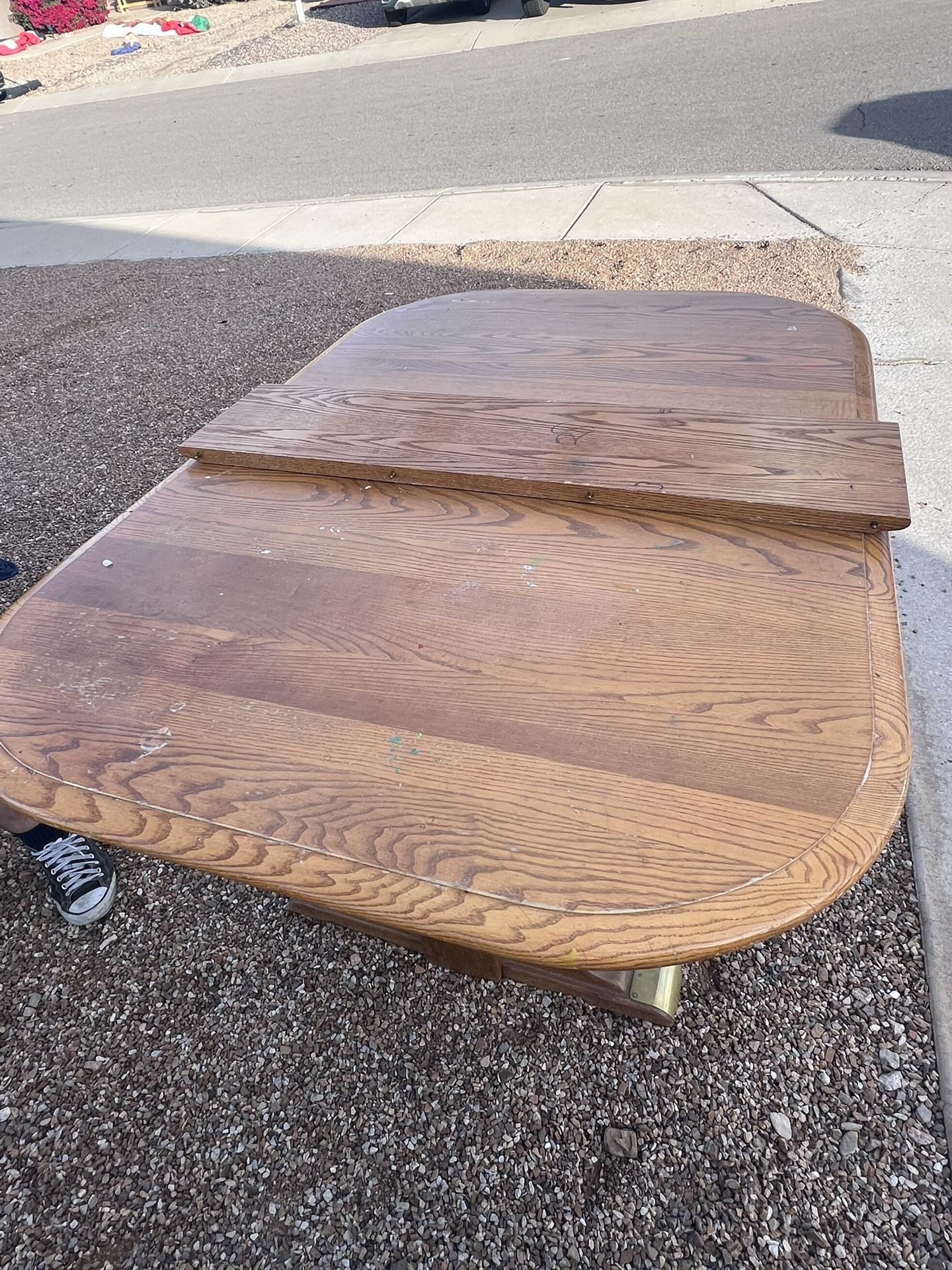 High end solid oak dining table with 2 leafs. Some scratches and stains but can be refinished and would be a beautiful table. No chairs. NW Tucson- Cortaro/I10. Must be able to pickup and load.