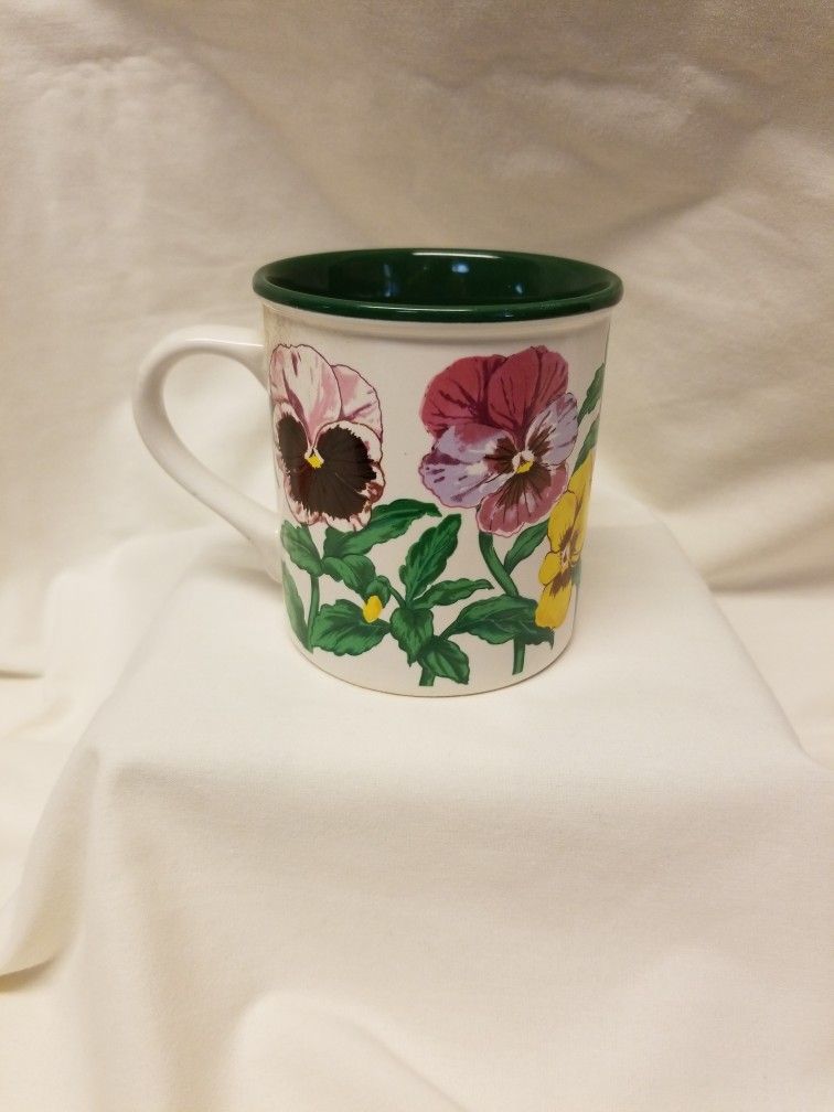 This is a lovely 3 1/4 in tall porcelain mug decorated with Pansies. I especially like the the solid green color inside the mug $5 OBO cash only please
