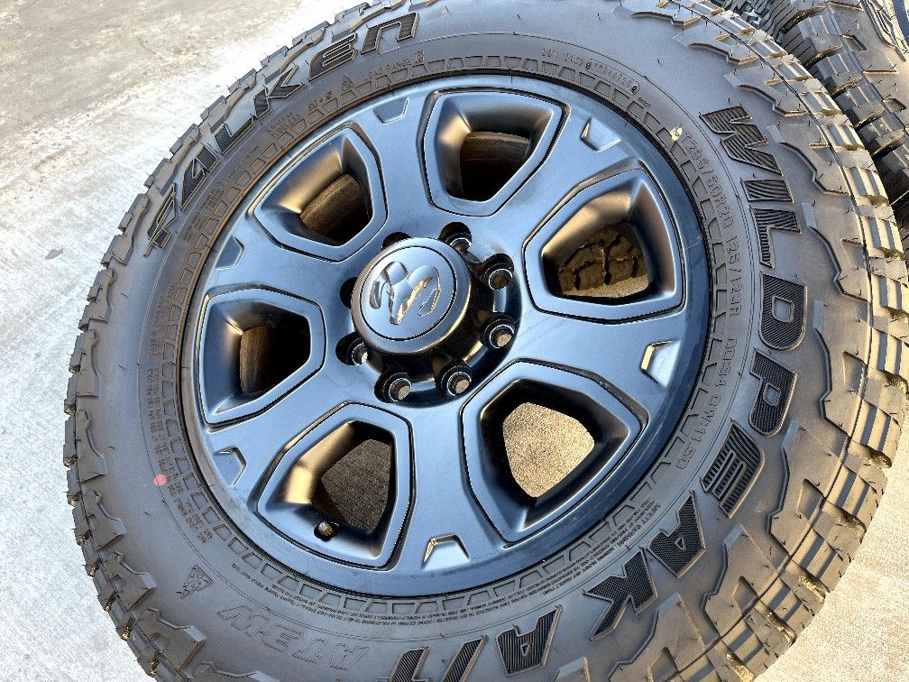 For sale is a set of 20" Ram 2500 Black Package wheels with Falken Wildpeaks AT3W LT 295/60R20 All Terrain tires. Tires have like new tread with less than 3k miles on them (see pictures). Removed because the truck was upgraded to aftermarket wheels and tires. Rims are in very good condition with no scratches or damage. Wheels are 20x8 with a 8x6.5 bolt pattern. These fit 2002-2020 Ram 2500/3500 trucks. Center caps included, balanced and ready to be mounted on your truck.