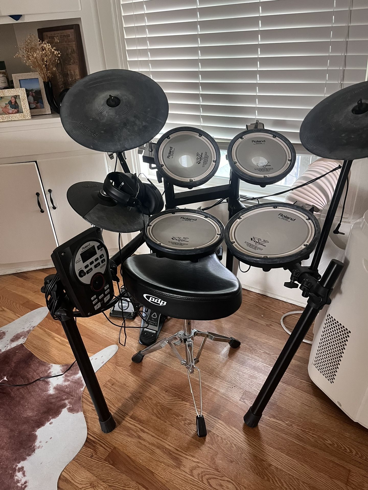 Roland TD-11 full electric drum set. This kit has no visible wear except for small stick marks on the cymbals, easily can be wiped away. Other than some dust, it’s perfect condition. Currently, all cords are set up how the kit should be set up. I will include the seat I purchased for it (it’s really comfortable), the headphones which are noise cancelling!!!, and two sticks!