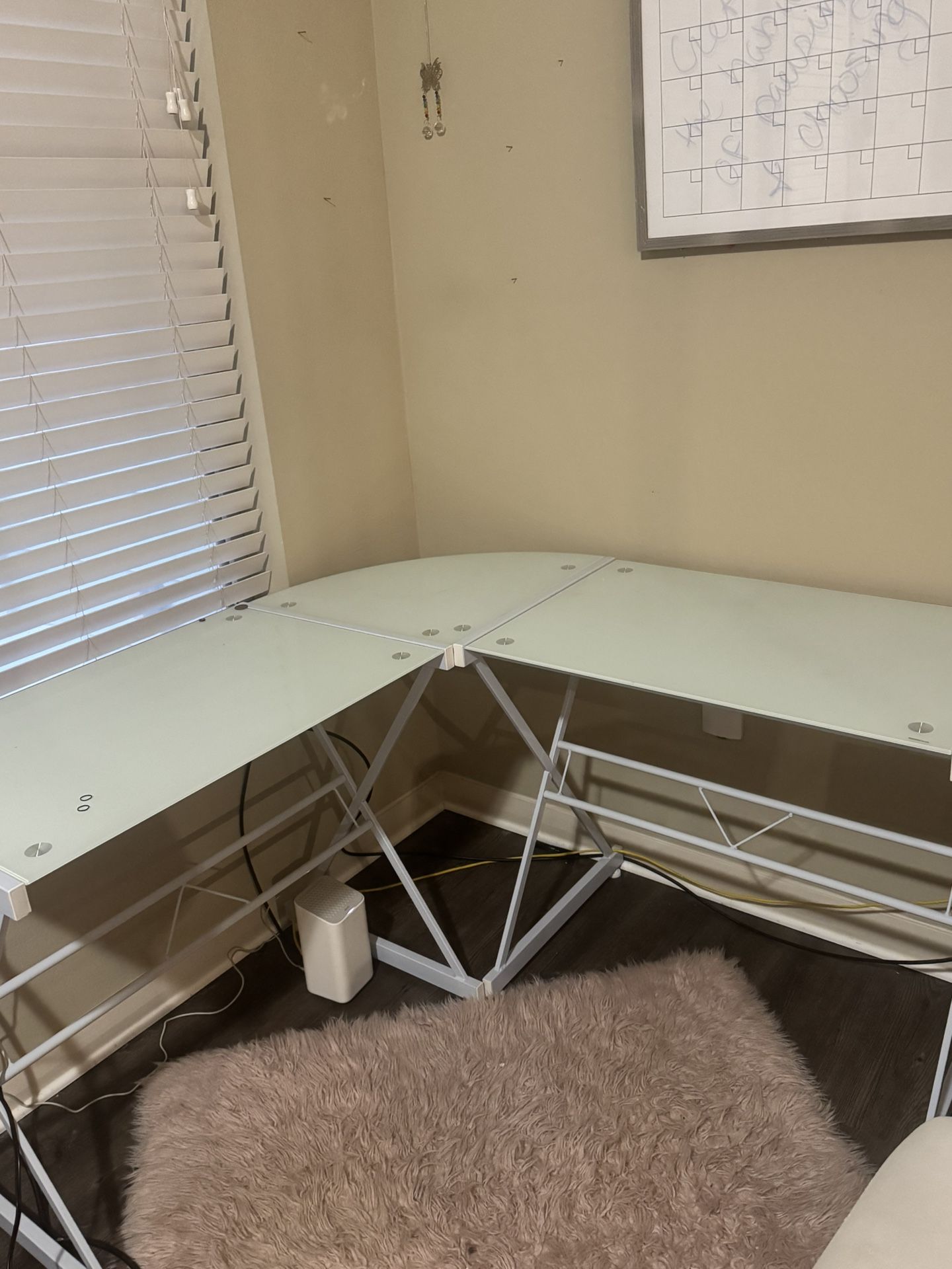 Selling a sleek L-shaped office desk with a tempered glass top and sturdy steel frame, perfect for a home office or workspace. Comes with a comfortable rolling office chair. Pickup only.